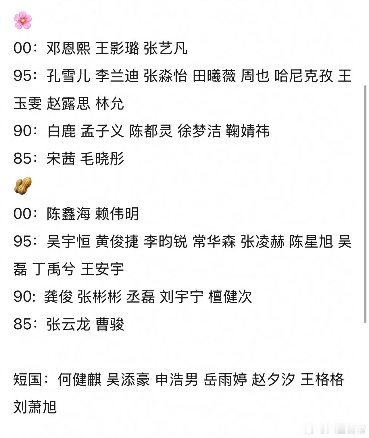 目前确认参加🐧星光大赏的名单星光大赏名单🌸00:邓恩熙 王影璐 张艺凡95:孔雪儿 李兰迪 张淼怡 田曦薇 周也 哈尼克孜 王玉雯 赵露思 林允 90:白鹿 孟子义 陈都灵 徐梦洁 鞠婧祎85:宋茜 毛晓彤🥜00:陈鑫海 赖伟明 95:吴宇恒 黄俊捷 李昀锐 常华森 张凌赫 陈星旭 吴磊 丁禹兮 王安宇90: 龚俊 张彬彬 丞磊 刘宇宁 檀健次85:张云龙 曹骏 短国:何健麒 吴添豪 申浩男 岳雨婷 赵夕汐 王格格 刘萧旭