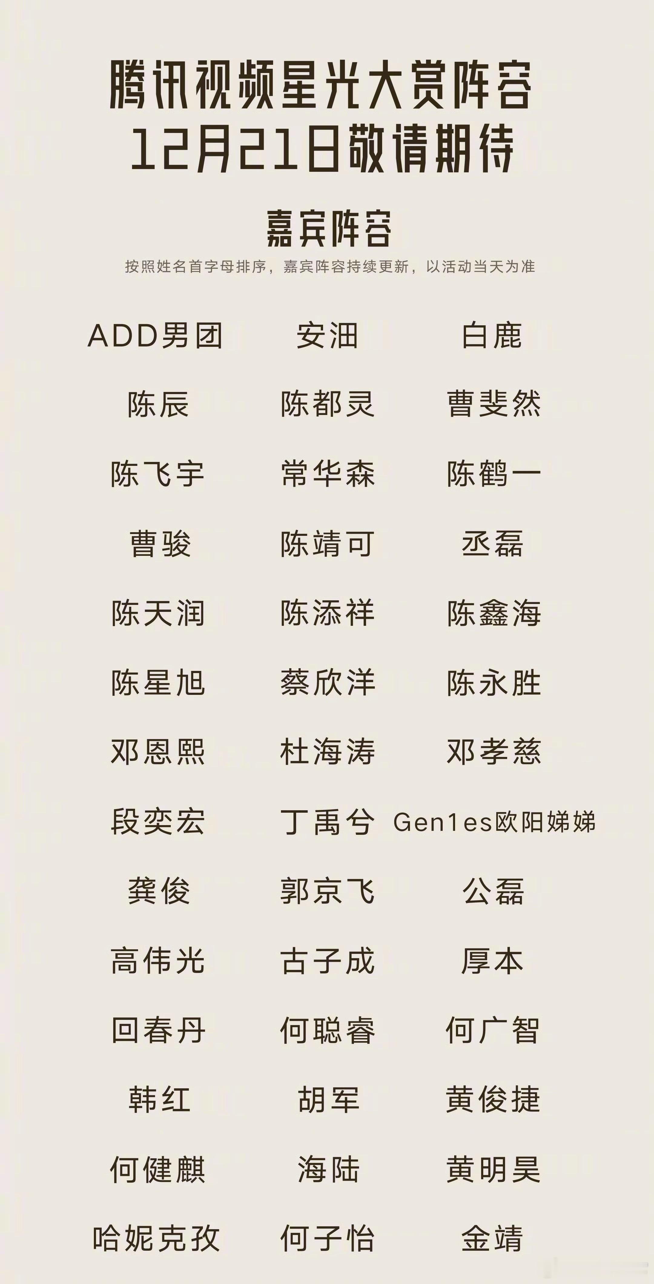 🐧2025星光大赏阵容官宣,好多人啊白鹿、陈都灵、陈飞宇、丞磊、丁禹兮、龚俊、鞠婧祎、刘萧旭、刘宇宁、李昀锐、孟子义、时代少年团、宋祖儿、檀健次、田曦薇、王安宇、吴磊、岳雨婷、张凌赫、赵露思、周也等139组艺人参加星光大赏阵容官宣
