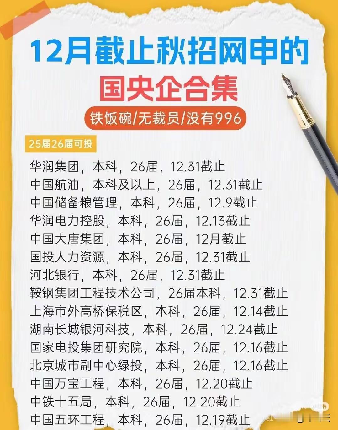 这60家央国企招聘正在报名,时间汇总合集!12月即将截止报名!这里汇聚超多好公司稀缺机会,千万不要错过!速速收藏起来备用![赞][赞][来看我][来看我] 这里面有民航华东空管局、国家电网华北分部、中体彩票运营管理等等央企大平台,还有河北高速集团、天津轨道交通公司、天津远洋集团、福建投资集团、杭州国投等等国企好公司。速速围观揭秘详细内容!欢迎关注@叮咚云 ,了解更多就业择业指导资料。 免责声明:图片来自网络,仅供参考! 国企招聘 央国企招聘 央国企秋招
