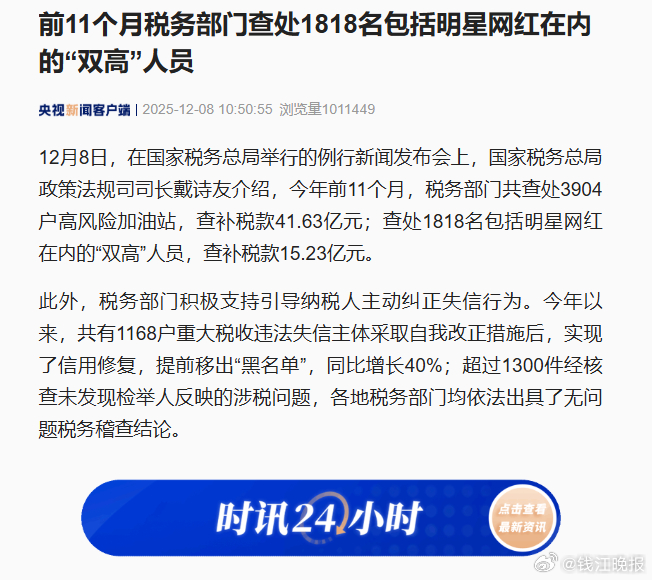 【税务部门:今年前11个月#查处1818名明星网红等在内双高人员#】今天,国家税务总局举行例行新闻发布会。国家税务总局政策法规司司长戴诗友介绍,今年前11个月,税务部门共查处3904户高风险加油站,查补税款41.63亿元;查处1818名包括明星网红在内的“双高”人员,查补税款15.23亿元。(央视新闻) #1818名包括明星网红在内双高人员被查#
