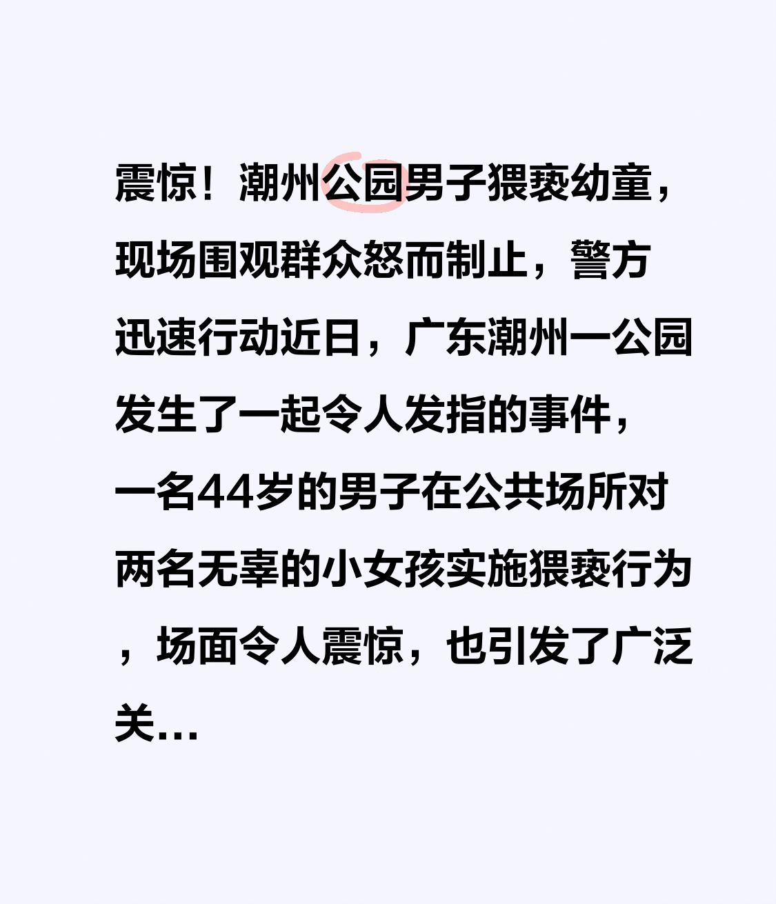 震惊!潮州公园男子猥亵幼童,现场围观群众怒而制止,警方迅速行动 近日,广东潮州一公园发生了一起令人发指的事件,一名44岁的男子在公共场所对两名无辜的小女孩实施猥亵行为,场面令人震惊,也引发了广泛关注和愤怒。 事情发生在一个阳光明媚的下午,公园里人流如织,孩子们在秋千上欢快地玩耍,笑声不断。就在这时,一名男子悄悄靠近正在荡秋千的小女孩,他的行为异常,眼神躲闪,似乎隐藏着不可告人的目的。男子走到秋千旁,毫无预兆地一屁股坐在秋千上,完全不顾周围人的存在。 就在距离男子较近的小女孩准备离开时,男子突然伸出手,将她搂住,试图拽回秋千。小女孩被突如其来的动作吓得大声呼喊,拼命挣扎,但男子力气大,死死抓住她不放。小女孩的哭喊引起了周围人的注意,另一名年纪更小的小女孩看到同伴受欺负,勇敢地冲上前,用小拳头狠狠地捶打男子的手臂,试图阻止他的恶行。 现场的群众一开始还没反应过来,但当看清情况后,愤怒的情绪顿时爆发。有的高声呵斥男子,有的拨打了报警电话。男子见状,试图挣脱,想要逃跑,但被众人团团围住,无法得逞。现场气氛紧张而愤怒,大家纷纷谴责他的行为。 很快,警方赶到现场,将男子控制住并带回派出所。经过调查,男子的行为涉嫌猥亵儿童罪,已被依法刑拘。目前,警方正在进一步调查取证,确保对嫌疑人依法严惩。 事发后,受惊的小女孩家长赶到现场,看着受惊的孩子,心疼得直掉眼泪。孩子的哭泣和惊吓让在场的每个人都感到愤怒和心疼。大家纷纷表示,儿童是祖国的未来,任何人都不能侵犯他们的权益,更不能对他们做出如此恶劣的行为。 这起事件再次敲响了社会的警钟。儿童的安全需要全社会共同守护,家长、学校、社区都应加强对儿童的保护意识。对于那些心怀不轨的犯罪分子,法律绝不容忍,必须严惩不贷,以儆效尤。 事件的发生也引发了网友的热烈讨论。有网友表示:“这样的事情太令人愤怒了,必须严惩,让犯罪分子付出代价!”也有人呼吁加强公共场所的监控和安保措施,防止类似事件再次发生。“保护儿童,就是保护我们的未来!”成为大家共同的心声。 警方提醒:如果发现类似的犯罪行为,公众应第一时间报警,不要自行制裁,以免发生二次伤害。社会各界也应共同努力,为儿童营造一个安全、温暖的成长环境。 这起事件让我们再次认识到,儿童的安全无小事。每个人都应成为儿童的守护者,用行动守护他们的纯真和幸福。希望法律能严惩此类恶行,也希望社会对儿童的保护意识能进一步增强,让每一个孩子都能在阳光下快乐成长。你认为一个人最可贵的品格是什么 猥亵要判刑
