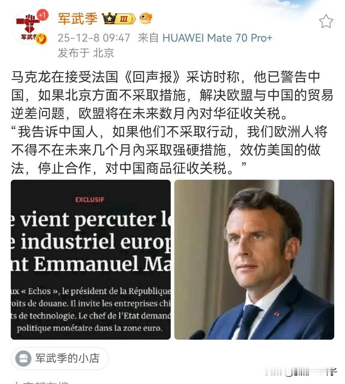 前几天马克龙在四川大学演讲,一群川大的学生把他像明星一样捧着,我是不是说过马克龙这个法国男人不靠谱、不可信。 这不马克龙才刚回国,就开始威胁对中国加关税了。 马克龙在接受法国《回声报》采访时妄言:如果中国不解决中国与欧盟的逆差,欧盟将在未来几个月内采取行动,效仿美国对中国加征关税。 当然同样还是那个理论,法国人的话不用信,尤其是法国男人的话,那是一个字都不用信。