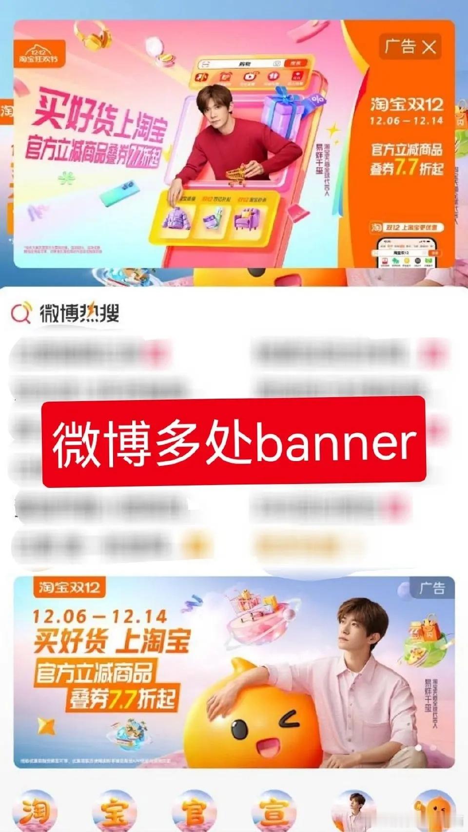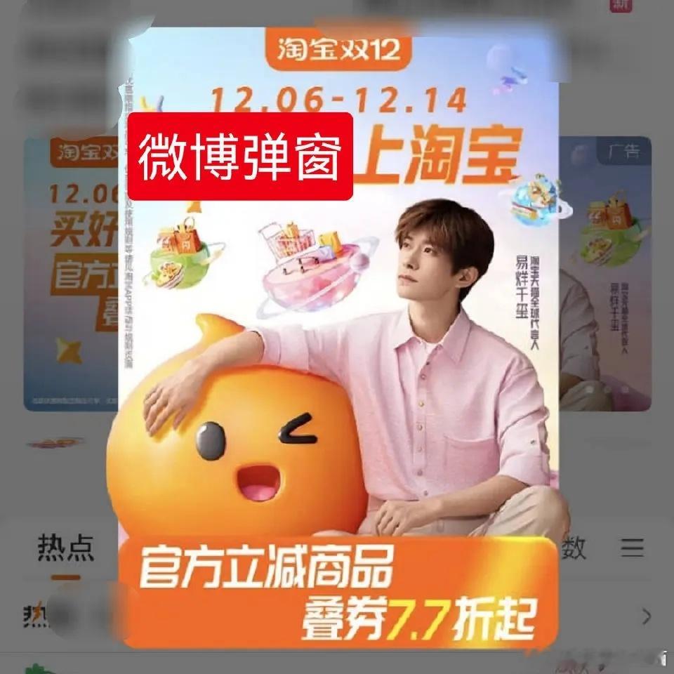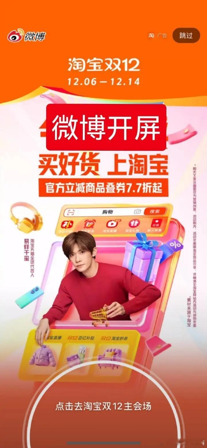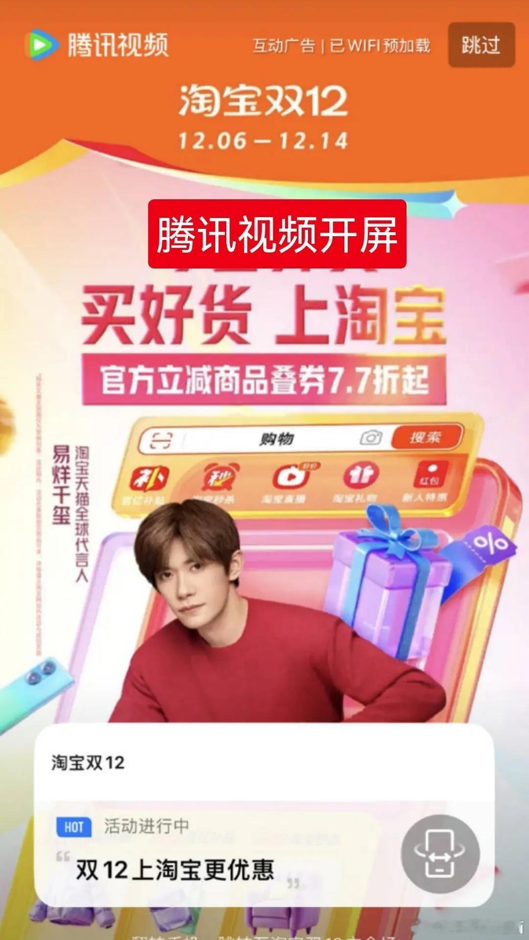 易烊千玺官宣淘宝天猫全球代言人,也是首位代言人!!!虽然上午才正式官宣,但是已经安排上各种开屏弹窗线下地广咯!微博开屏、弹窗/b站、腾讯视频、qq音乐、网易云音乐、酷狗音乐开屏 、线下大屏地广、电梯广告……影帝待遇