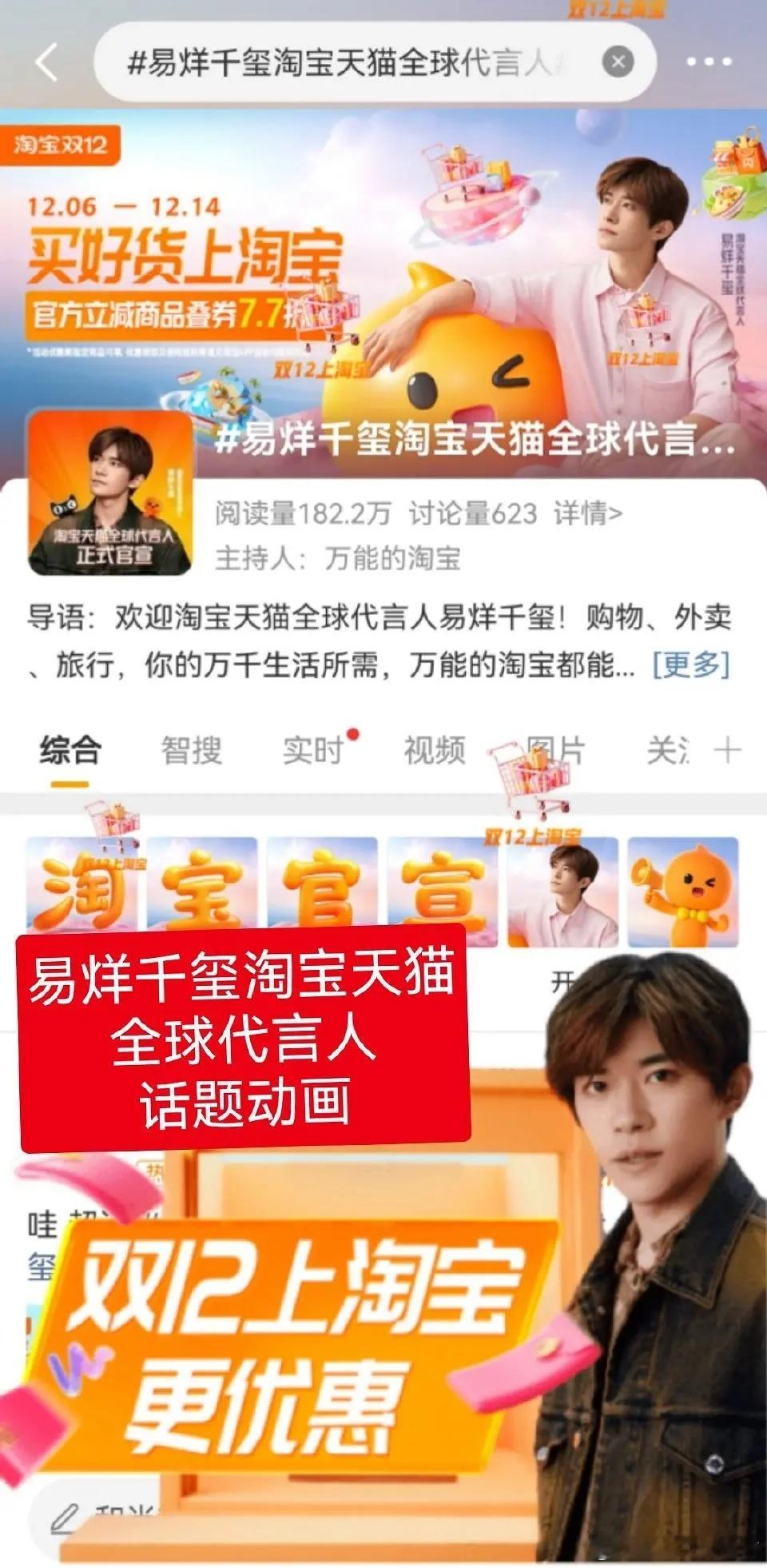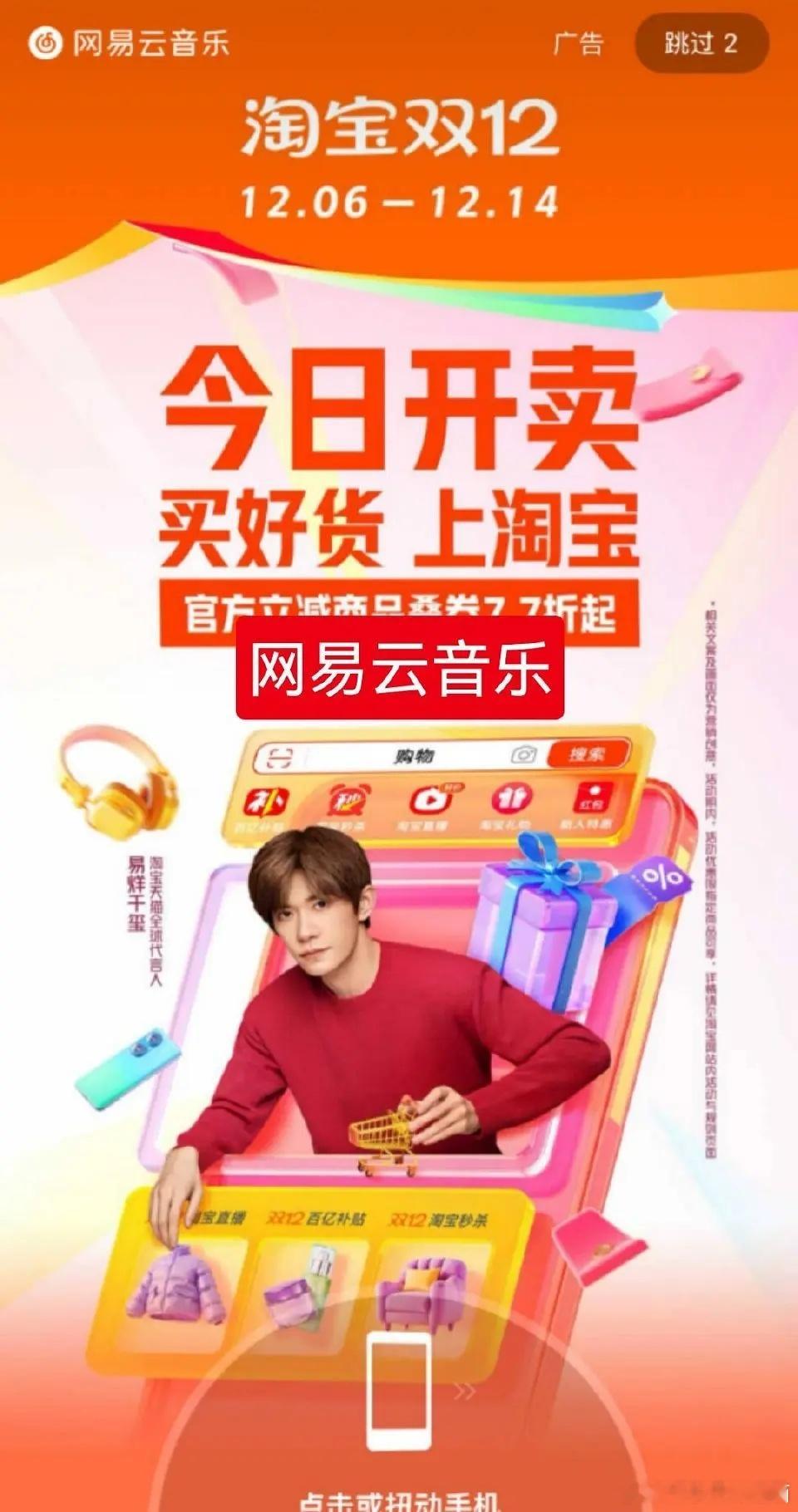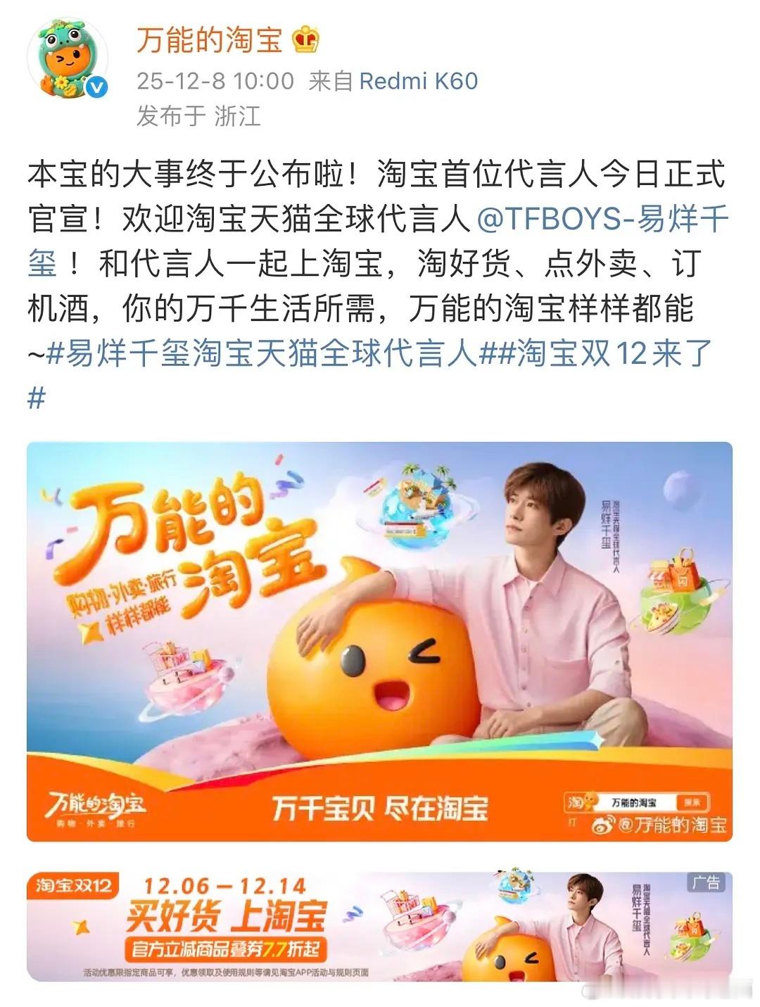 易烊千玺官宣淘宝天猫全球代言人,也是首位代言人!!!虽然上午才正式官宣,但是已经安排上各种开屏弹窗线下地广咯!微博开屏、弹窗/b站、腾讯视频、qq音乐、网易云音乐、酷狗音乐开屏 、线下大屏地广、电梯广告……影帝待遇