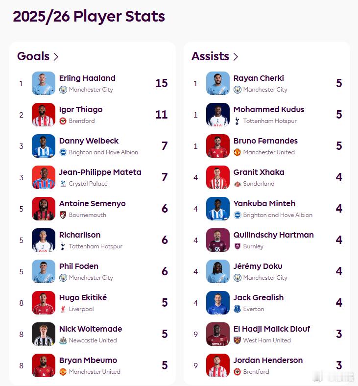 曼城 联赛才踢了15轮,现在判断冠军归属还早。但是当我们看到目前英超射手榜第一和助攻榜第一都是曼城的球员,是不是至少可以肯定地说,曼城依然是阿森纳最强竞争者?切尔基联赛10场1球5助,欧冠1进球,联赛杯1球1助。22岁的法国人在曼城建立了自信,有一种预感,一个前场全能球星就要诞生了,曼城球迷不再总是念叨德布劳内。
