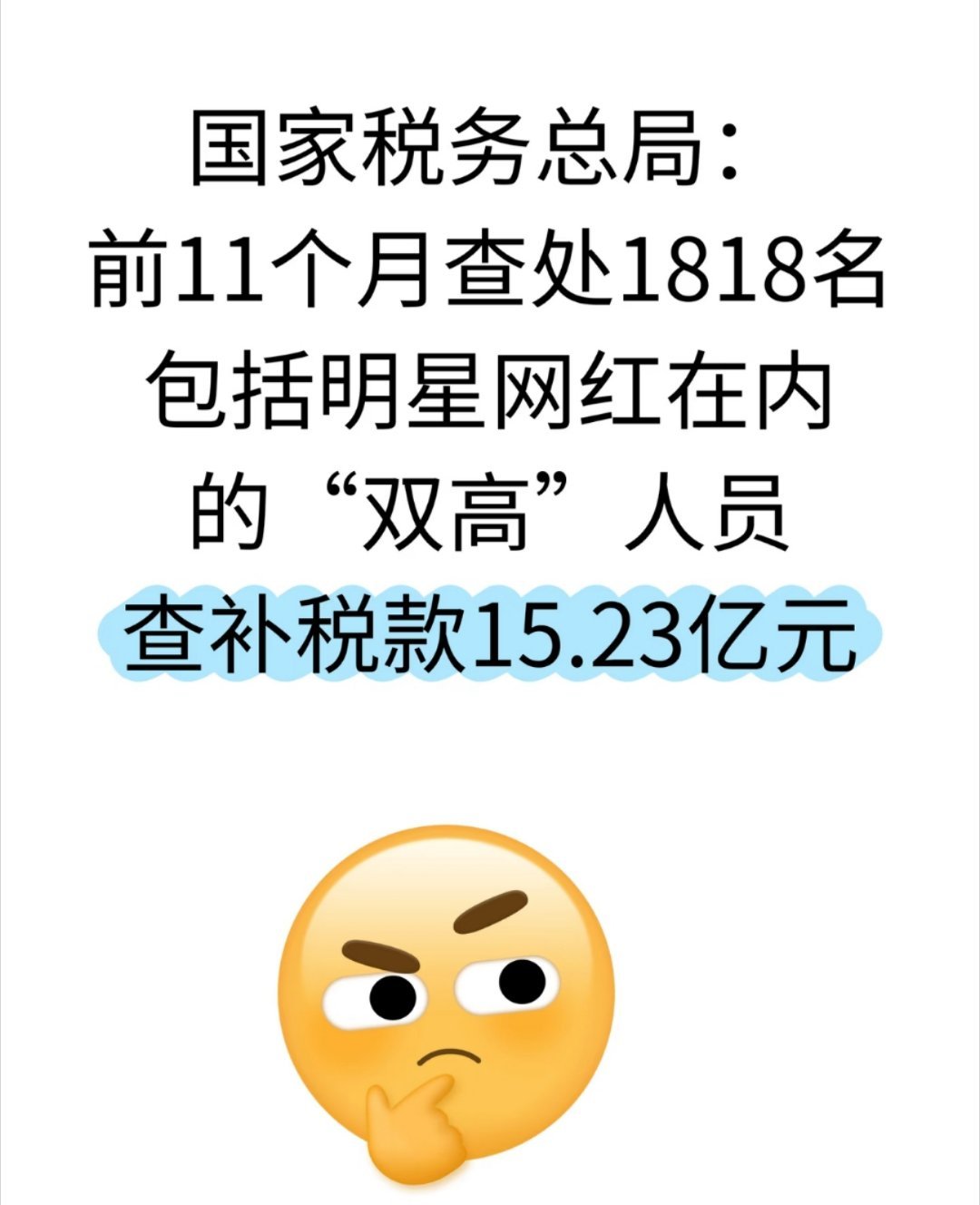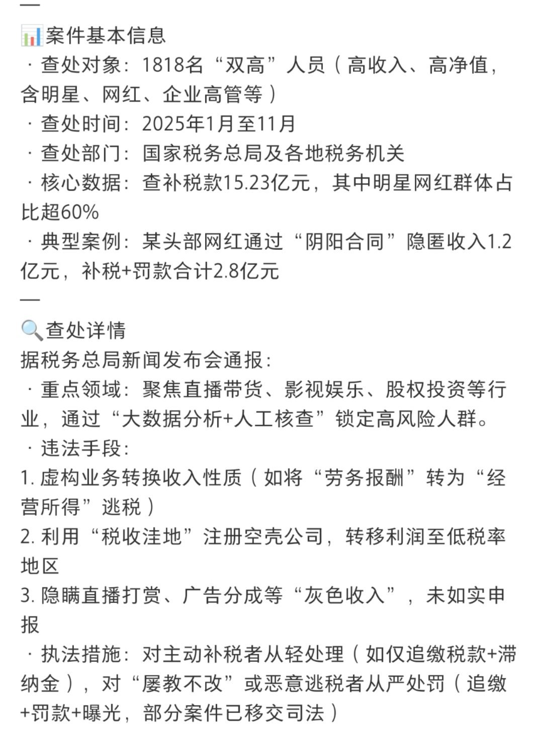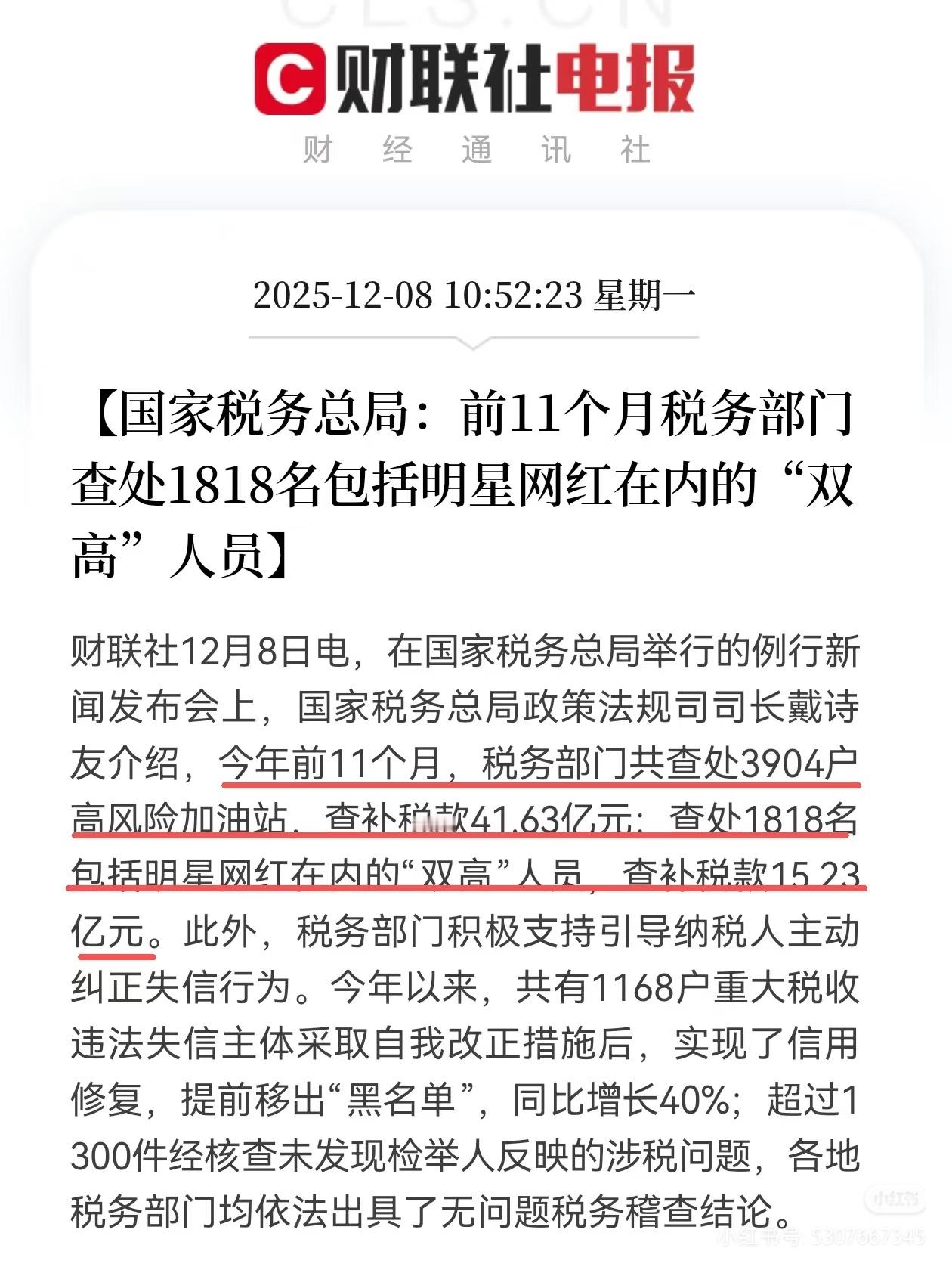 1818名包括明星网红在内双高人员被查谁家又要塌房了?税务部门通报:多位明星、网红被查!12月8日,在国家税务总局举行的例行新闻发布会上,国家税务总局政策法规司司长戴诗友介绍,今年前11个月,税务部门共查处3904户高风险加油站,查补税款41.63亿元;查处1818名包括明星网红在内的“双高”人员,查补税款15.23亿元。
