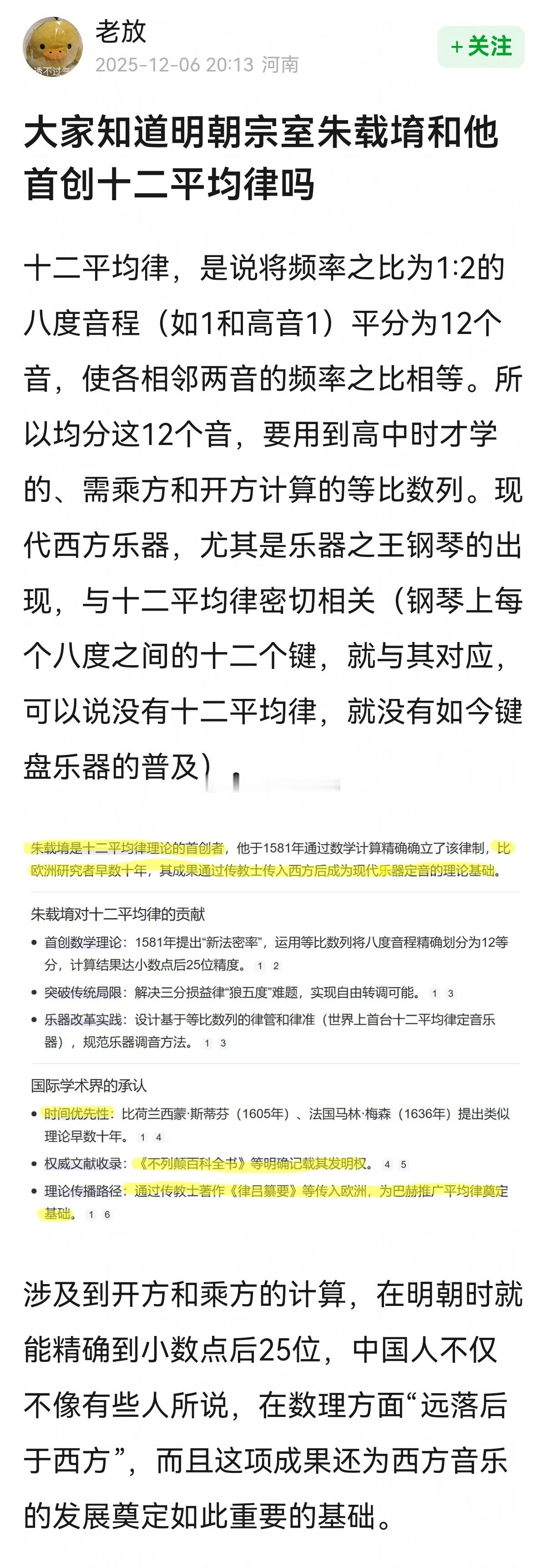 才知道,太优秀了→明朝宗室朱载堉和他首创十二平均律!!
