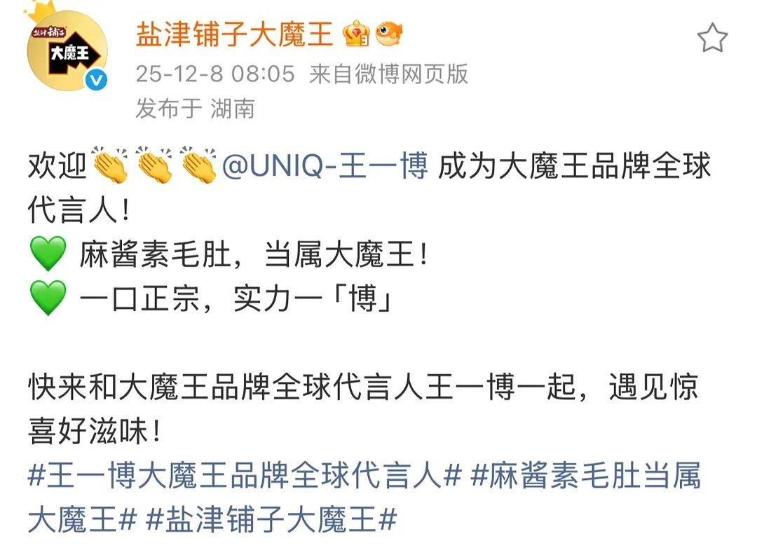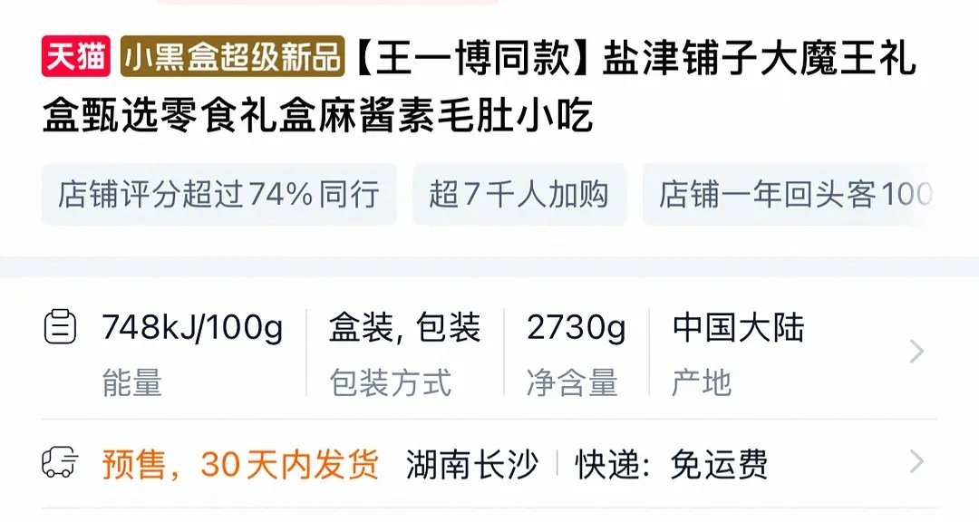 王一博官宣盐津铺子【大魔王品牌全球代言人】,三个平台现货秒售罄,已买成了预售~