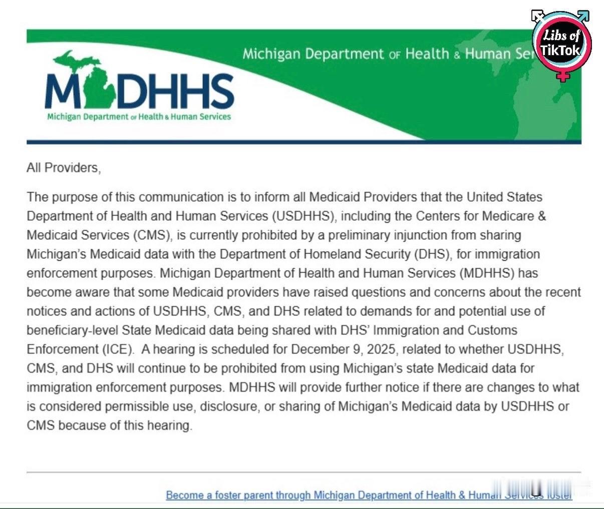 独家消息:美国密歇根州卫生与公共服务部向所有医疗服务提供者发送了这封电子邮件,该公告旨在告知所有 Medicaid 提供者,美国卫生与公众服务部 (USDHHS) 及其下属的医疗保险和医疗补助服务中心 (CMS) 目前被一项初步禁令禁止与国土安全部 (DHS) 共享密歇根州的 Medicaid 数据,用于移民执法目的。 但民主党人坚称非法移民没有获得福利…… 民主党人为什么要向美国移民及海关执法局(ICE)隐瞒数据?