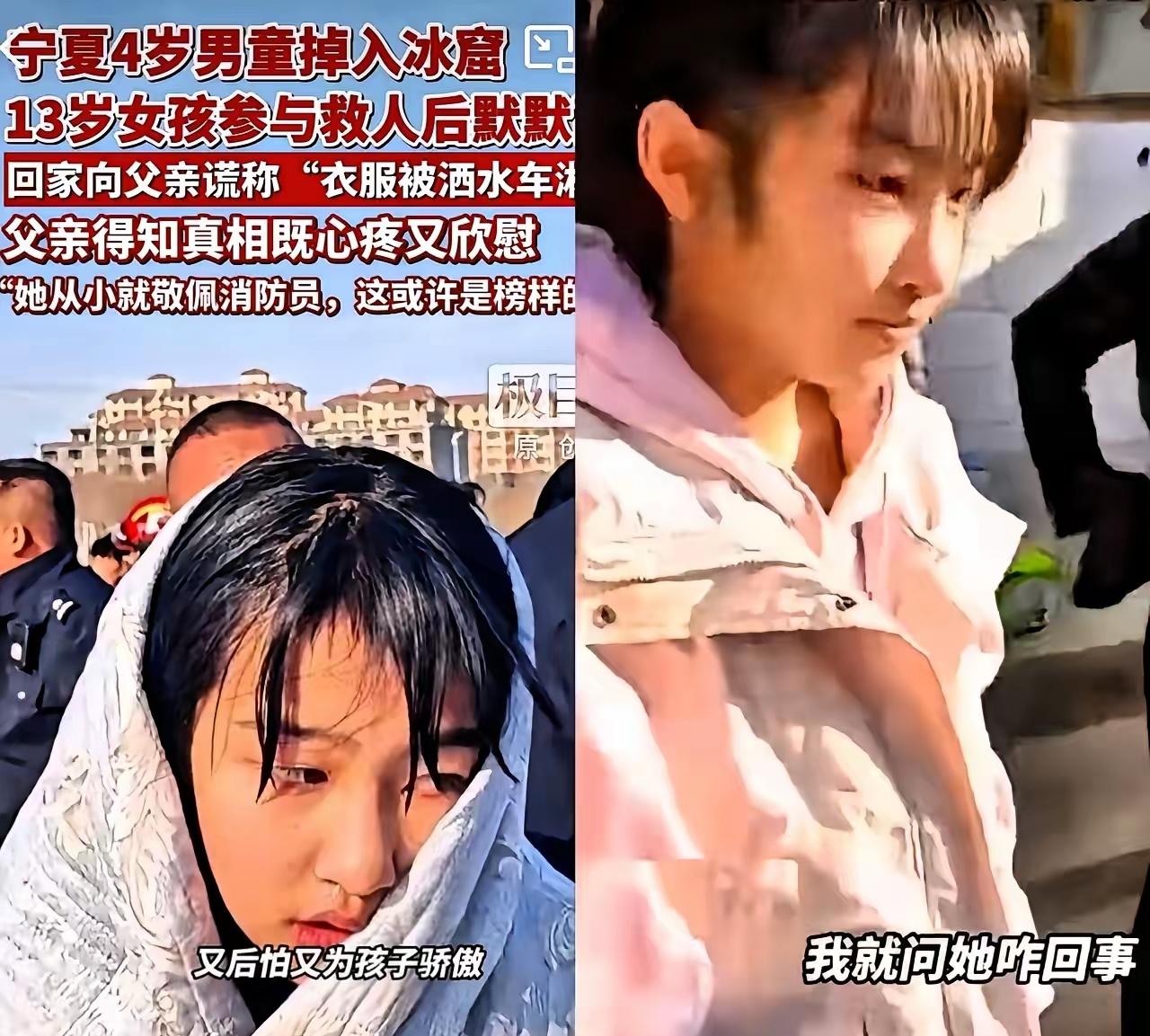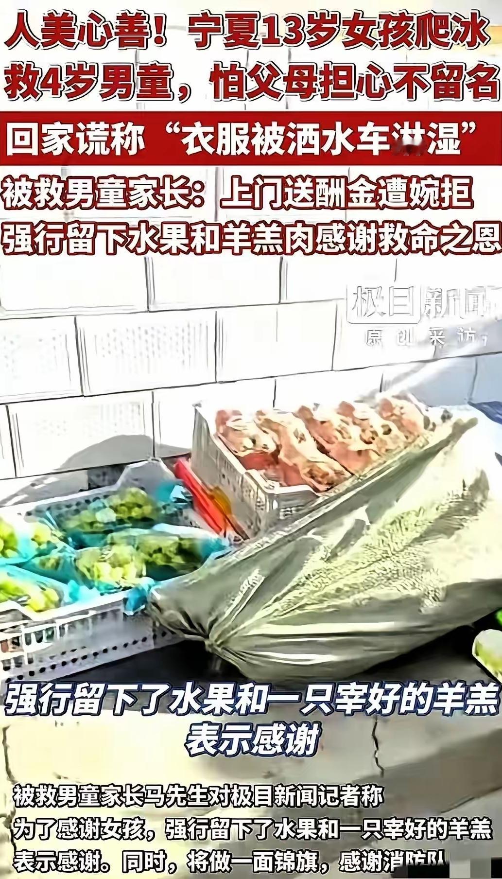 宁夏13岁女孩李佳婷救起的4岁男童的家长,上门给救命恩人送来了酬金、水果以及一只宰好的羊羔肉,但是酬金被女孩家长婉拒,只能强行留下了其他! 这位13岁女孩,人美心善,一副菩萨相。在危机时刻,毫不犹豫挺身而出,救出落水男孩,自己却悄无声息的离开。回到家,没有向爸爸妈妈炫耀自己的见义勇为,而是怕家人担心说成:一不小心被洒水车淋湿,懂事的让人心疼! 一个13岁未成年的孩子,能在寒冷的冬季,舍己救人,其品格何其高尚!小小的身躯大大的爱,华夏儿女,值得敬佩! 萌娃救人事迹 女孩勇救男子