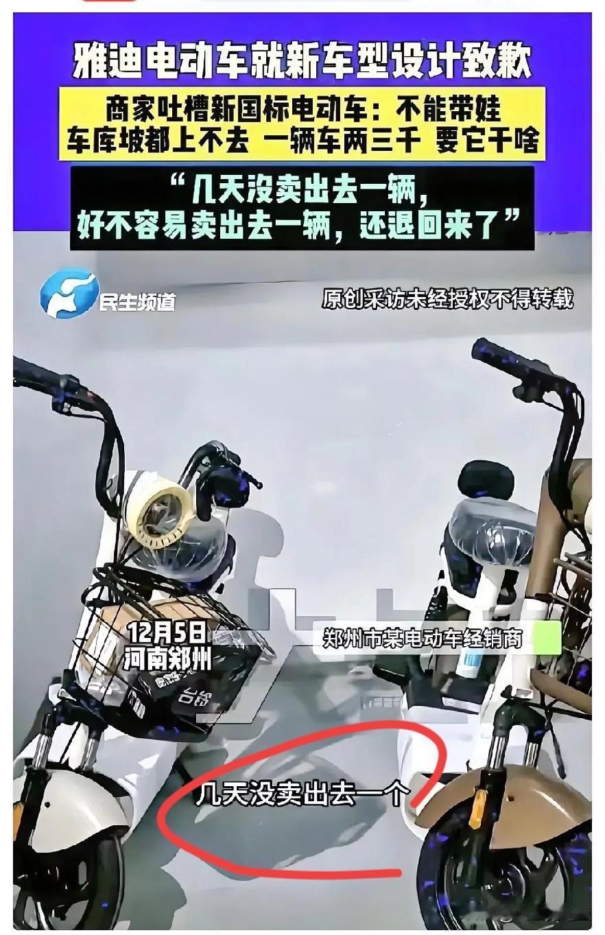 终于破案了! 闹了半天,原来让我们换车的“专家”,就是卖车给我们的雅迪自己? 雅迪表示:我们对新国标的标准理解不准,所以才会出现这样的设计,不过我们有亲子版的车型,只是上市的节奏跟不上。 消费者:你们是在玩套路吧? 故意不给消费者提供更好的车型,让消费者多花一些冤枉钱,再过一段时间推出更实用的车型? 雅迪电动车作为行业内龙头企业,居然设计出如此不合理的电动车,难道不是对消费者的一种欺骗行为吗? 大家觉得呢?