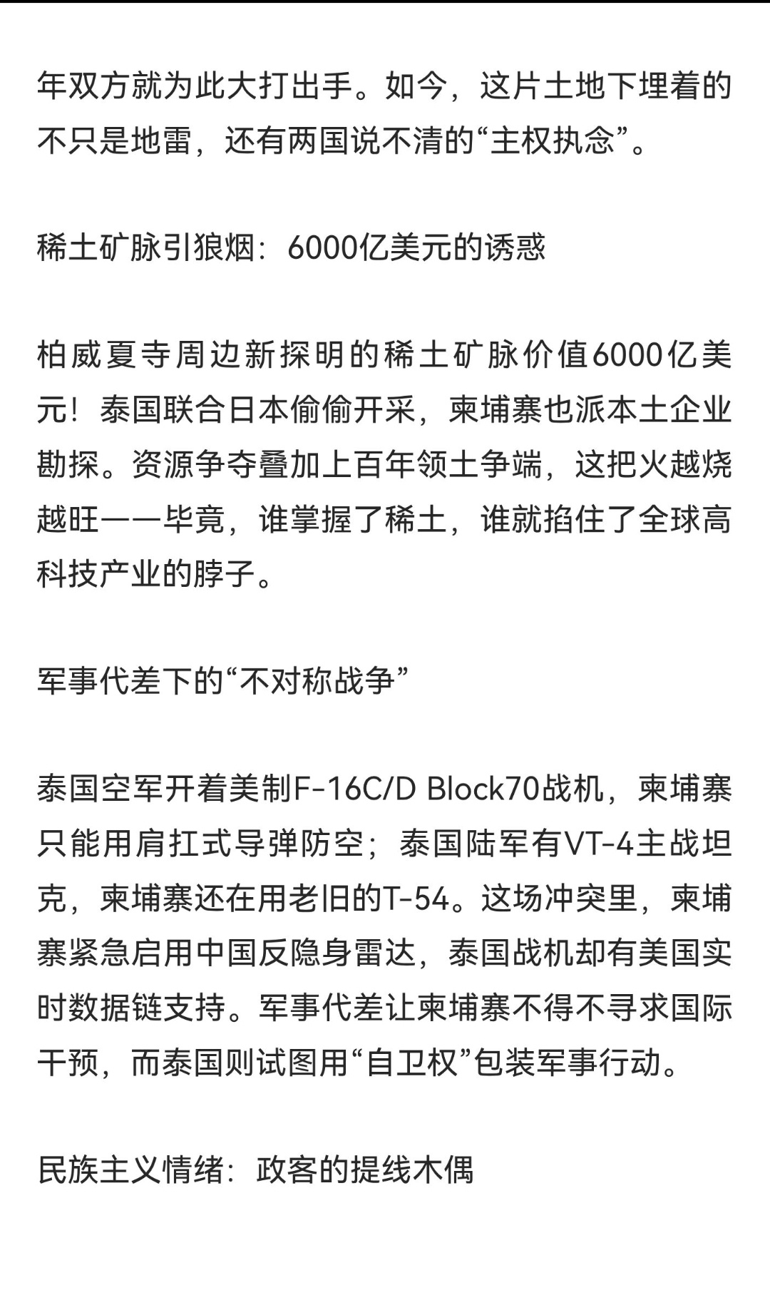 |柬泰边境又双叒叕打起来了!12月8日清晨,泰国F-16战机呼啸着划破天际,对柬埔寨军事目标发动空袭,柬方则用BM-21火箭炮还击,双方互控对方先开火。这场“罗生门”式冲突背后,藏着百年历史恩怨和现实利益博弈。1907年法国殖民者随手画的地图,把柏威夏寺划给柬埔寨,却没划清周边4.6平方公里归属。泰国觉得“不公平”,柬埔寨坚持“国际法背书”。2008年寺庙申遗成功,泰国民族主义者直接炸锅,2011年双方就为此大打出手。如今,这片土地下埋着的不只是地雷,还有两国说不清的“主权执念”。柏威夏寺周边新探明的稀土矿脉价值6000亿美元!泰国联合日本偷偷开采,柬埔寨也派本土企业勘探。资源争夺叠加上百年领土争端,这把火越烧越旺——毕竟,谁掌握了稀土,谁就掐住了全球高科技产业的脖子。泰国空军开着美制F-16C/D Block70战机,柬埔寨只能用肩扛式导弹防空;泰国陆军有VT-4主战坦克,柬埔寨还在用老旧的T-54。这场冲突里,柬埔寨紧急启用中国反隐身雷达,泰国战机却有美国实时数据链支持。军事代差让柬埔寨不得不寻求国际干预,而泰国则试图用“自卫权”包装军事行动。泰国代理总理普坦刚上任就强硬对柬,背后是他信家族与军方的权力斗争;柬埔寨首相洪玛奈需要“硬姿态”巩固军心。两国政客把边境冲突当提线木偶,用民族主义情绪转移国内矛盾,可苦了边境3.5万撤离的平民——他们要的不是“国家尊严”,只是一口安稳饭。从地雷到空袭,从领土到稀土,柬泰冲突像面镜子,照出东南亚地缘政治的脆弱性。历史积怨难解,现实利益难分,这场烽火何时能熄?或许,只有当两国政客放下“民族主义大旗”,真正坐下来谈利益分配,边境才能迎来真正的和平。