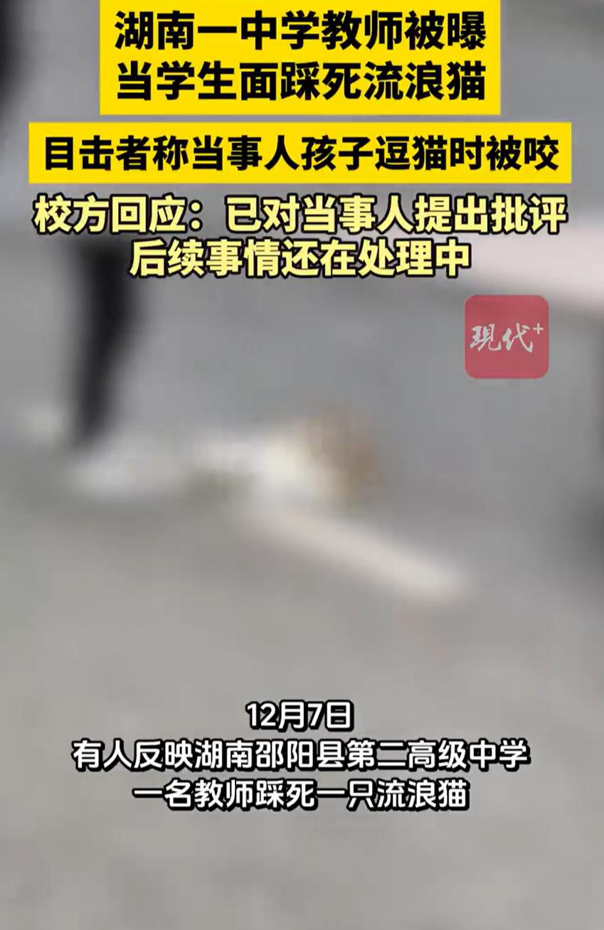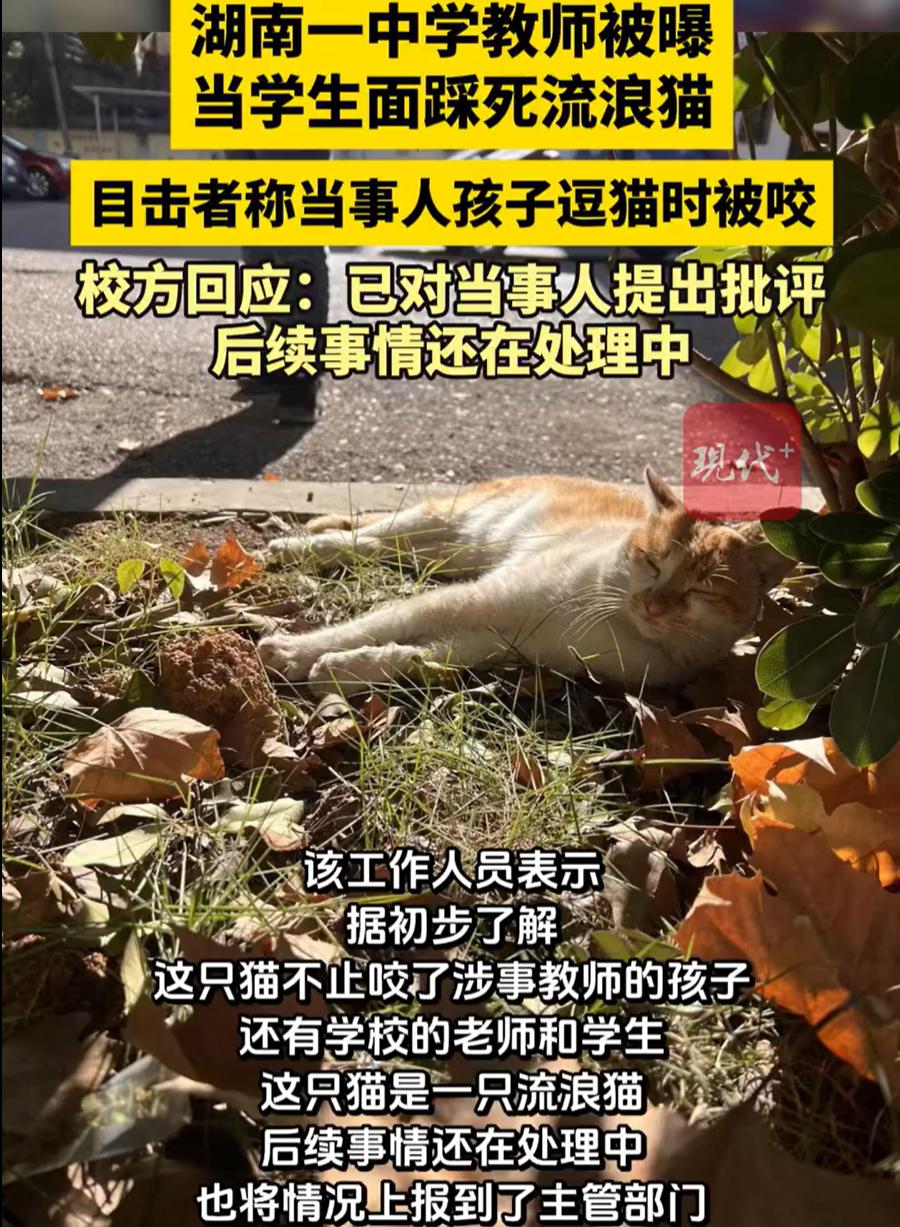 吵翻天!湖南邵阳,一只流浪猫正躺在学校路上晒太阳,一名男老师突然走过来,当着学生们的面一脚将小猫踩死,一时间,学生们都没反应过来,也没来得及阻止,事后校方回应,这个小猫挠过人,网友也是看法不一 据了解,这个事有两方说法,一方面是学生介绍,这只橘猫很多学生都认得它,时常喂它,猫也长得胖乎乎的,平时会在校门口晒太阳,平时大家看到它,总觉得只是校园里的一道小风景 而学校方面回应,事情起因是这位老师的孩子去逗猫时被咬了一口,而且这只猫不仅咬过这个孩子,还曾咬过其他学生和老师。所以老师的反应非常激烈,只是这个行为,把在场不少同学都给吓到了 目前,学校方面还在处理此事,而网友们对此事的讨论也是相当激烈 有人觉得猫伤人在先,情有可原;更多人却无法接受,毕竟是一条生命,而且是以这样粗暴的方式,在学生面前处理,实在说不过去 其实我觉得,这不是一件非黑即白的事。我们得承认,流浪猫狗在校园里,确实存在安全隐患,孩子被咬,家长愤怒,完全可以理解。学校有责任维护一个安全的环境 但问题的核心,或许并不在于“猫该不该处理”,而在于“人该如何处理” 这位老师选择了一种最极端、最暴烈、也最具视觉冲击力的方式——当众一脚踩死。这里面,有泄愤的成分,有展示权威的成分,也可能有一种“快刀斩乱麻”的简单思维。但唯独缺少的,是对生命的起码敬畏,和对自己职业身份的认知 他是老师,面前站的是学生。教育不仅在课堂里,更在老师的言行举止中。这一脚,踩死的不仅是一只猫,也可能踩碎了一些孩子心里对善意、对克制的认知。他们学到的是:当你拥有力量,当你情绪上头,可以用最原始的方式解决矛盾 对此,你有什么看法?