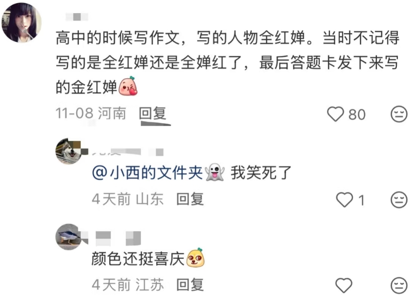 高中的时候写作文,写的人物全红婵。当时不记得写的是全红婵还是全婵红了,最后答题卡发下来写的金红婵。