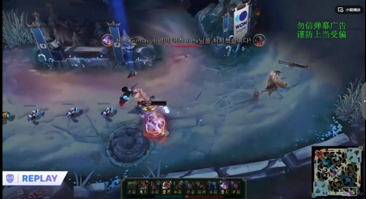 [13:30]Juny的8级剑魔下路绕后,但是被Gumayusi的10级芸阿娜直接开大拉扯+W闪后撤躲过大灭斩,再次下路一打二双杀收尾!上路HLE野辅双大留人,中路Zeka瑞兹也是越塔对位单杀1换1!这波HLE相当于击杀GEN四人!8K经济差了!