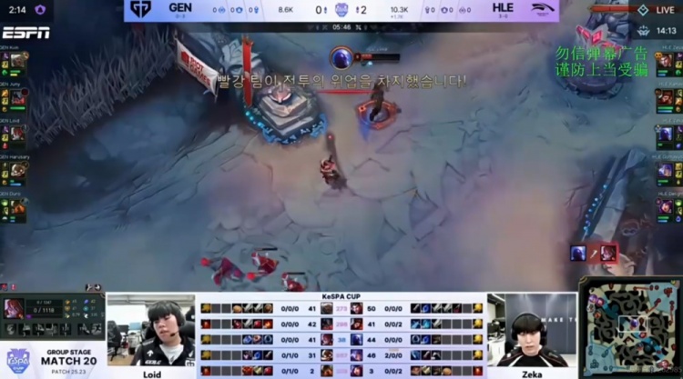 [17:18]野区遭遇Loid阿萝拉绕后大招但是伤害不够啊!自己想Q残血Kanavi猴子被秀了!Gumayusi芸阿娜收下击杀,已经超神了!两队经济差来到一万一了!随后库奇中路被抓,Duro泰坦和Kiin安蓓萨也都被逮捕!打出0换3的HLE带着先锋推掉下路想一波啊!但是GEN复活还是太快了!Kiin安蓓萨切死Gumayusi芸阿娜,GEN送给HLE一个团灭,但是自家已经一个门牙塔没了!