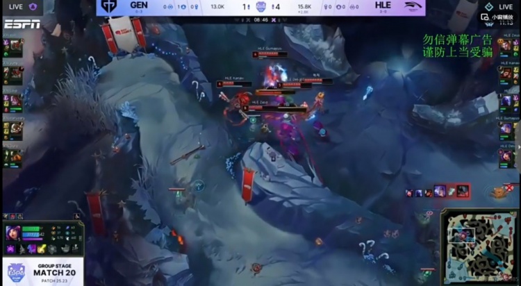 [21:58]Delight妮蔻大三个!HLE击杀GEN四人,22分钟结束比赛!