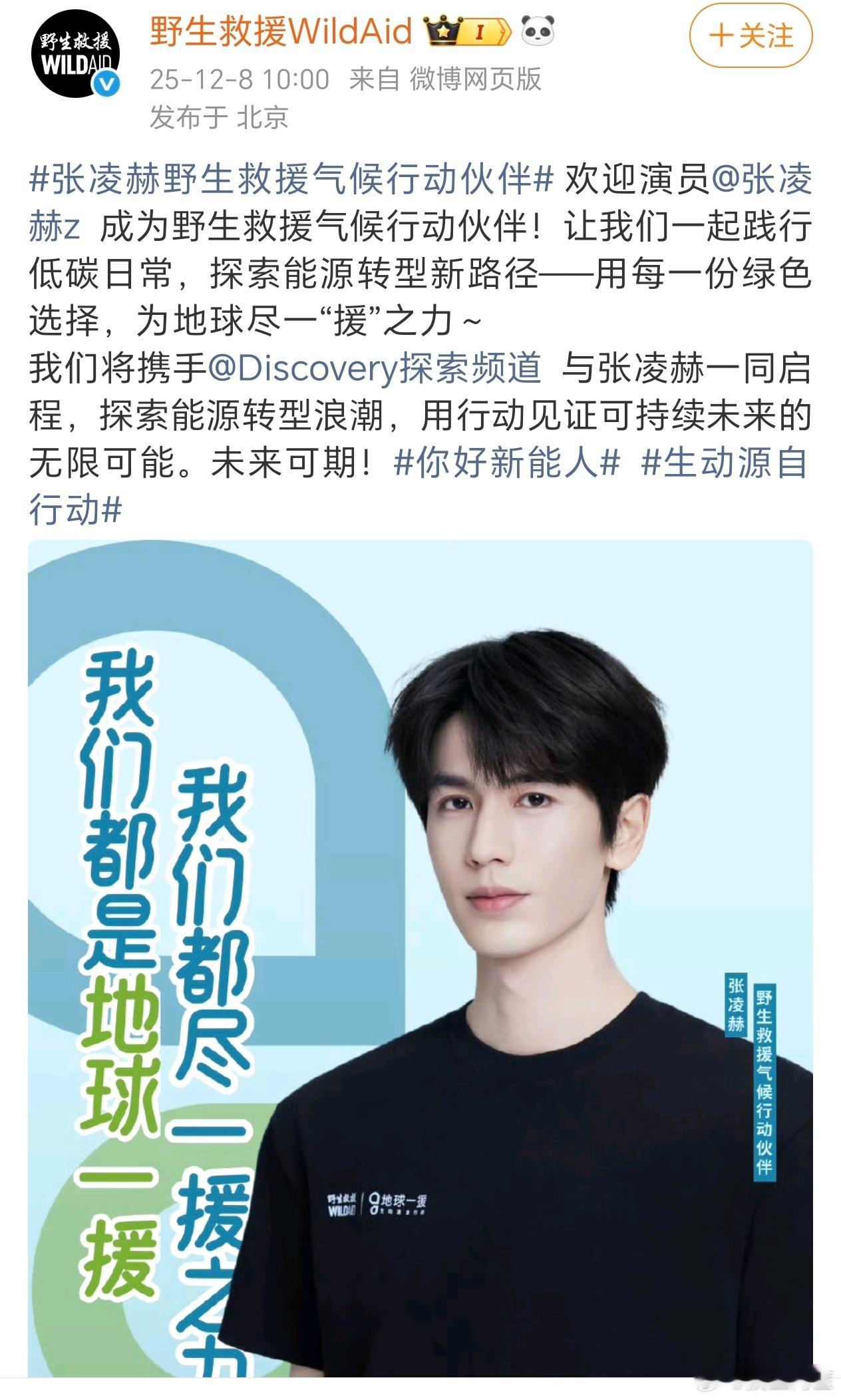 张凌赫WildAid野生救援气候行动伙伴官宣,可以开始期待帅哥的公益纪录片了!张凌赫野生救援气候行动伙伴