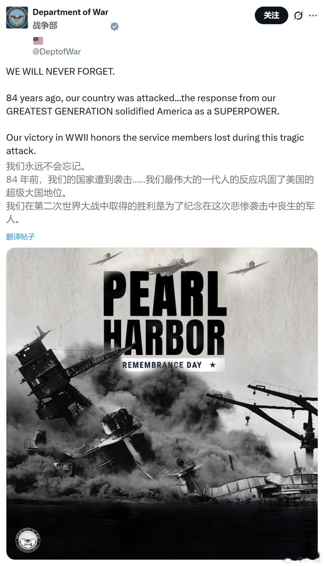 美国战争部:我们永远不会忘记。84 年前,我们的国家遭到袭击……我们最伟大的一代人的反应巩固了美国的超级大国地位。我们在第二次世界大战中取得的胜利是为了纪念在这次悲惨袭击中丧生的军人。你看,美国官方发布内容和公开演讲从来不提是谁偷袭了珍珠港,而日本官方发布内容和公开演讲也从来不提是谁投掷了原子弹,你就知道什么叫“历史是任人打扮的小姑娘”了!
