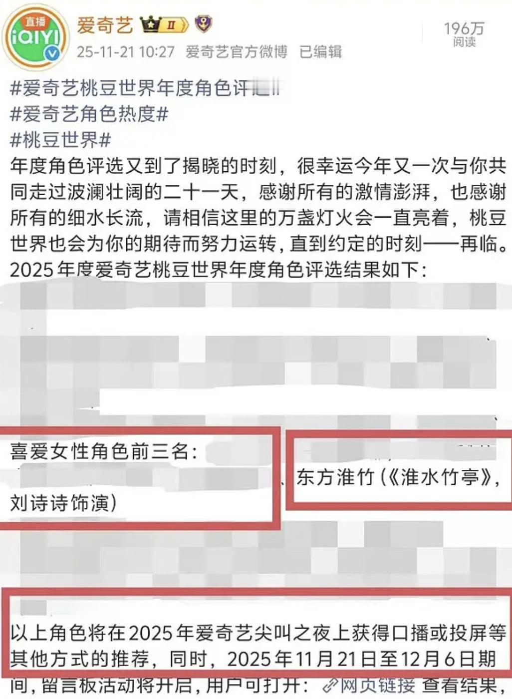 刘诗诗粉丝在维权明明是年度喜爱角色投票的第二,最终结果却被白鹿替换了,粉丝要求