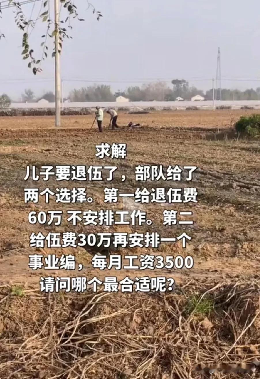 老汉很迷茫。他的儿子当了8年兵要退伍了。面临一个很难的抉择。到底是要退伍费还是要工作。要是选择要退伍费,就这一次性退六十万。如果要选择工作,只能退30万。大家觉着,选择哪个更划算呢? 我觉得现在工作那么难找,那找一个事业编单位太难了,还是要选择工作放在第1位。减少一点就无所谓的,现在60万也不算什么。