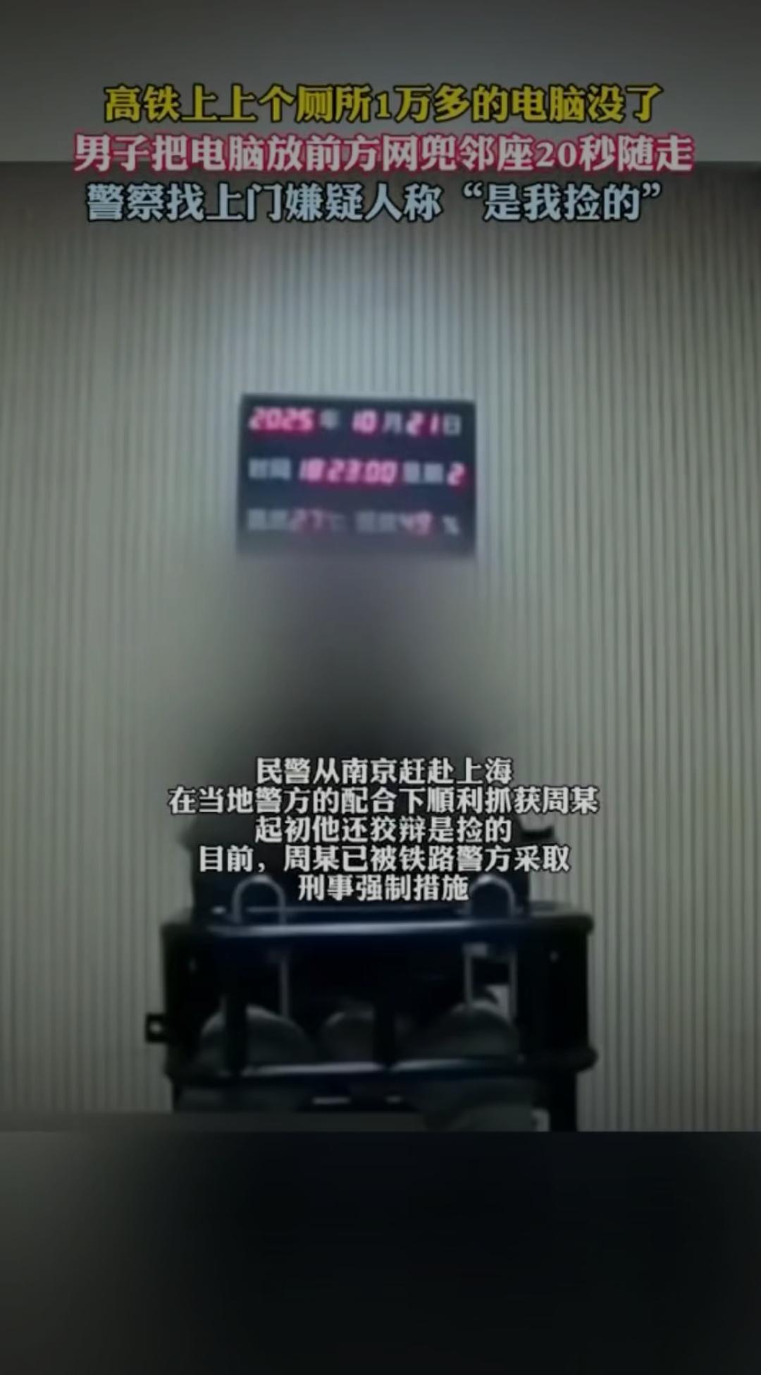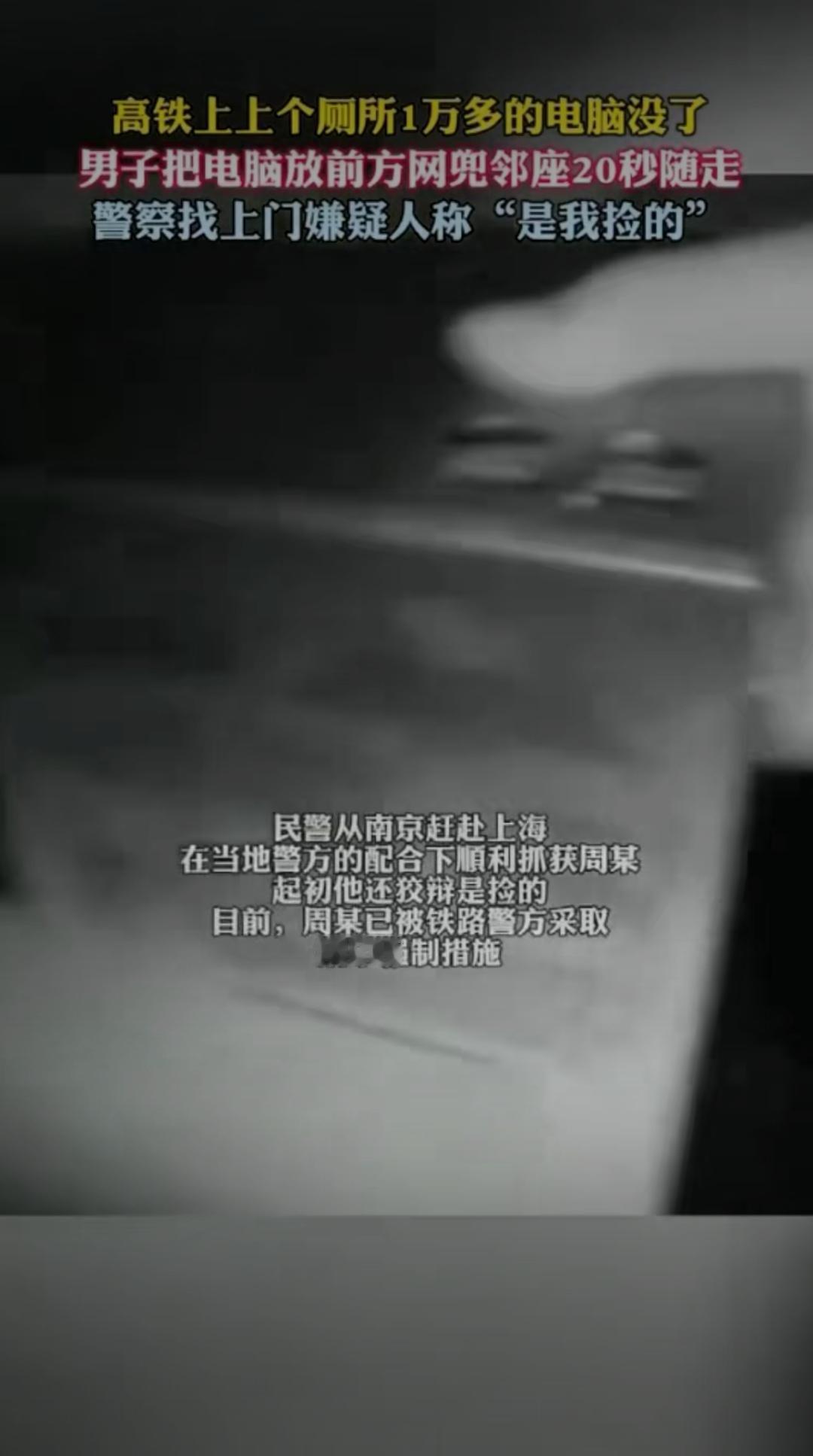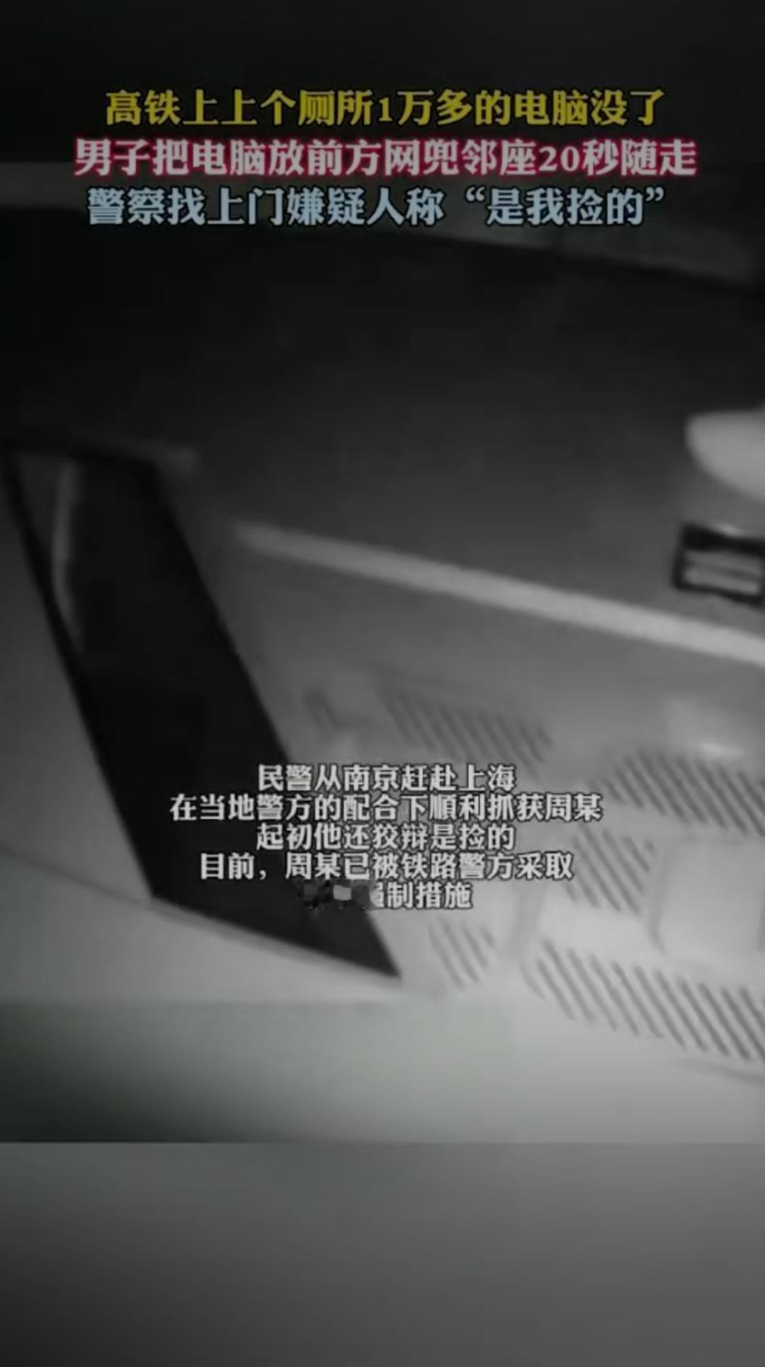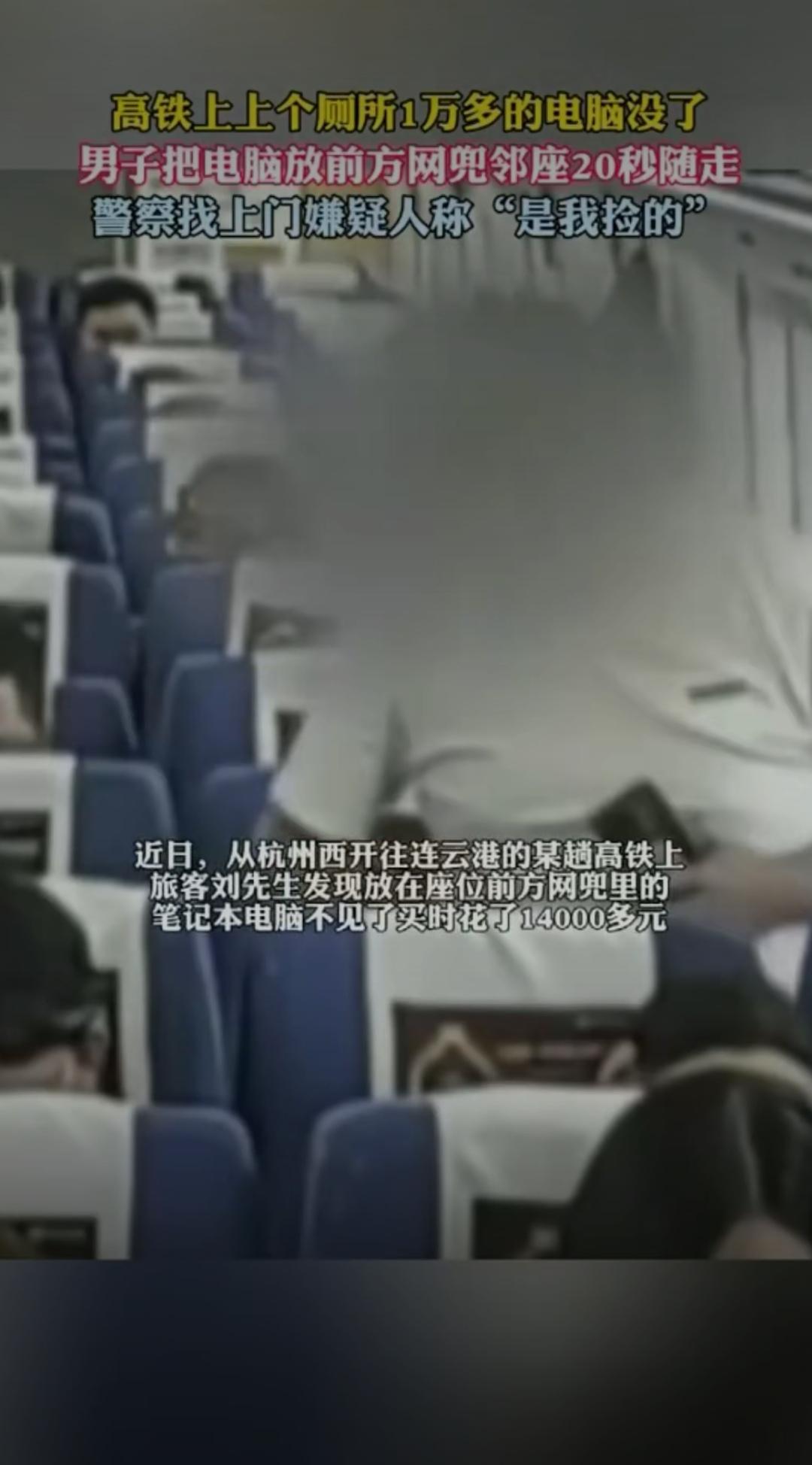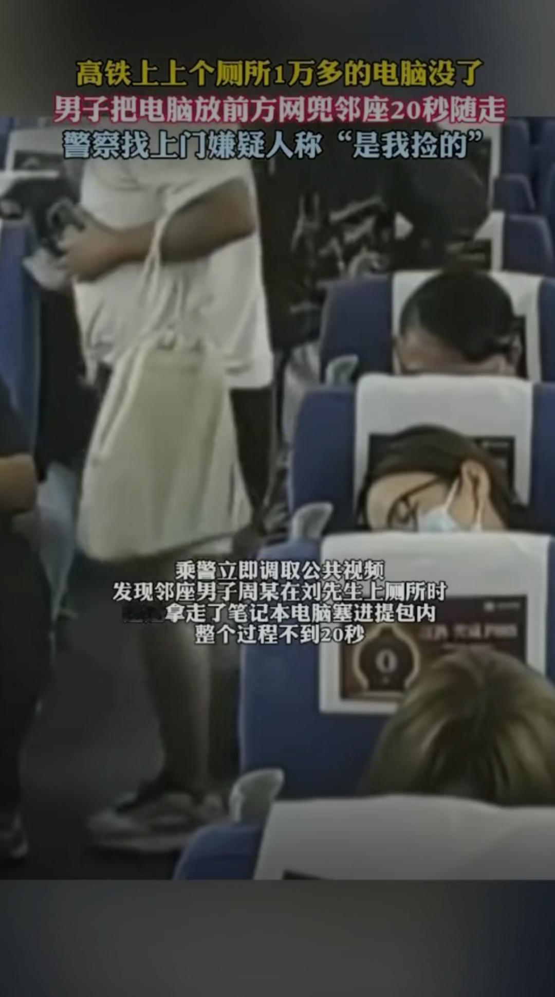高铁上上个厕所1万多的电脑没了!男子把电脑放前方网兜,邻座20秒随走,警察找上门,嫌疑人称"是我捡的"贪念毁终身 谁能想到,上趟厕所的功夫,1万2的笔记本电脑就不翼而飞?上海的陈先生出差时,把装满工作资料的笔记本电脑放在座位前方的网兜里,想着去趟洗手间不过两分钟,没成想这短暂的离开,竟让电脑“不翼而飞”。 等他匆匆返回座位,网兜早已空空如也,瞬间惊出一身冷汗——电脑里存着公司核心项目文件,一旦泄露损失不可估量。他立刻联系高铁工作人员报警,调取监控后,真相让人大跌眼镜:就在他离开的20秒内,邻座的男子王某趁周围乘客不注意,起身伸手将电脑从网兜取出,塞进自己的背包,随后迅速下车换乘,整套动作行云流水,显然早有预谋。 警方通过大数据追踪,仅用3小时就锁定王某的位置,找上门时,他还在试图删除电脑里的文件。面对质问,王某却理直气壮:“我不是偷,是捡的!网兜里没人要的东西,我拿了怎么了?”这番说辞让陈先生又气又无奈:“那是我特意放在网兜的,怎么就成没人要的了?” 更让人唏嘘的是,王某家境并不差,有稳定工作,只是看到电脑成色较新,一时起了贪念,就抱着“没人发现”的侥幸心理下了手。最终,他因盗窃罪被依法处理,不仅要全额赔偿陈先生的损失,还留下了案底,影响了自己的职业生涯。 事件曝光后,网友们炸开了锅:“20秒下手,这分明是明抢!还敢说捡的,贪念真能让人丧失底线”“出门在外真得小心,网兜、桌板都不是安全存放处”“一时贪念毁终身,太不值得了”。 其实这事儿的本质,藏着人性中最容易失控的“贪念”:看似是“捡”,实则是“偷”,区别就在于是否守住了道德和法律的底线。高铁上的公共空间从不是法外之地,任何心存侥幸的贪念,最终都会付出代价。 你觉得王某的“捡来的”说法能成立吗?出门在外你会把贵重物品随意放置吗?欢迎在评论区聊聊你的看法!