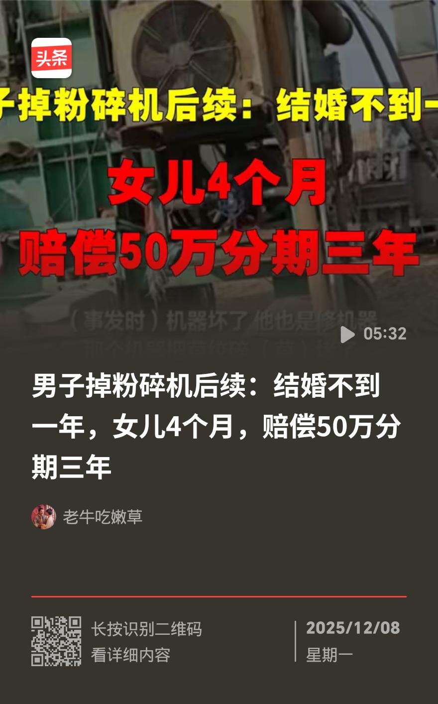 4个月女婴丧父!男子被粉碎机吞噬,老板50万分3年赔引众怒 结婚不到一年,女儿刚满4个月,河南男子王某却在草场干活时惨遭秸秆粉碎机吞噬,仅余一条小腿,而老板姚某的赔偿操作更让家属寒心! 今年10月底王某入职姚某的草场,因懂维修被调岗。11月19日凌晨5点下班的他,仅休息3个多小时就被老板紧急召回,日均工作近20小时的高强度劳作,让他身心俱疲。转天下午,粉碎机进料口堵塞,姚某直接安排王某维修,既未要求切断总电源,也无专人监护,王某带着遥控器就登上挖掘机搭建的平台。 毫无预兆间机器突然启动,等同事切断电源时,王某已被卷入。同在草场打工的母亲得知噩耗当场昏倒,家庭瞬间崩塌。可协商赔偿时,姚某起初只愿赔10万,称是王某误触遥控器、违规操作,还拿安全培训签到表推卸责任。 家属反驳,该粉碎机缺红外急停等基础防护,遥控器无防误触设计,且草场长期让工人带电维修、疲劳作业,安全培训只是走形式。经调解,赔偿提至50万,但姚某坚持分3年支付,先付15万还放话“不同意就一分没有”。 目前王某遗体仍未下葬,家属已委托律师起诉。律师表示,草场未提供安全作业环境需担主要责任,若查实长期忽视安全管理,姚某可能涉重大责任事故罪。 这起悲剧警示:企业绝不能拿员工生命换效益,安全生产底线碰不得。打工人遇到违规用工、安全隐患,要及时留存证据维权。 需要我整理一份“安全生产事故维权证据清单”,帮你明确该收集哪些关键材料吗?牧草打碎机 木破碎粉碎机 木破碎粉碎机