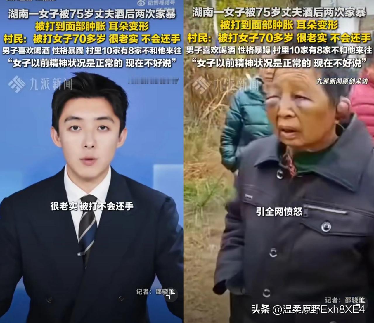 家人们,辟个谣 之前发的湖南被家暴女子,不是45岁 今年已年过七旬!女子以前精神状况是正常的,现在不好说(村民提供) 记者走访被打女子所在村庄,据村民说,她老公陈某明喜欢喝酒,性格暴躁!夫妻俩有一儿一女,女儿已出嫁,身体不好,儿子在外打工。 村民还说,老太很可怜,也很老实,被打从不还手!村民也希望能好好处理,不然陈某明放出来再打她,邻居不一定知道。 另据媒体报道,湖南平江县相关部门工作人员表示,详细情况需待调查结束后统一回应。 在知道她实际已70多了,更觉得气愤,那“饺子耳”岂不是代表她被自己老公家暴了一辈子吗? 这老公还是个人吗,平时这么下狠手打老婆就没人管吗? 还有她的那双儿女,连自己亲妈都保护不了,都是死人废物吗?恶毒老东西必须严惩! (信息:九派新闻)