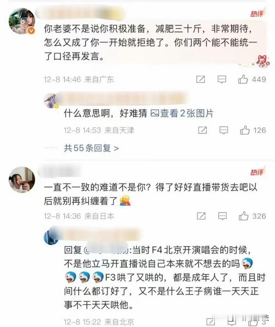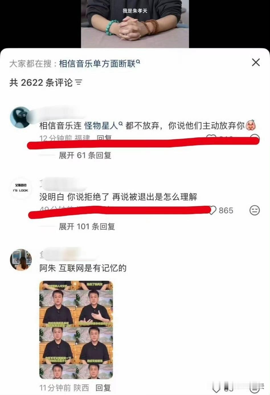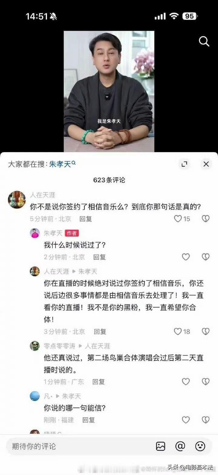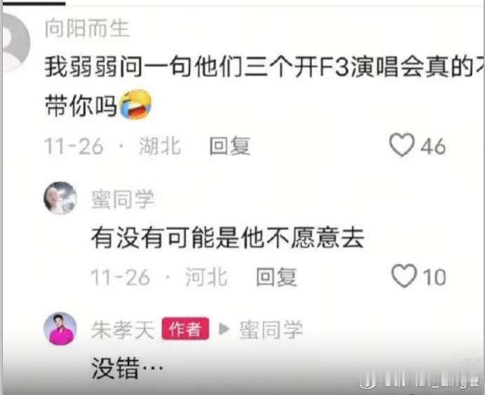 朱孝天不忍了,强势回应了! 12月8日下午14时30分,朱孝天亲自发布视频回应“退出F4演唱会”传闻,回应要点如下: 第一,和相信音乐没有任何合约,因为之前拒绝了3次要求,相信音乐就单方面切断了联系; 第二,关于朱孝天泄密导致F4演唱会延期,又因泄密导致被取消合作,这些全是谣言,我朱孝天和大家一样,看了新闻才知道自己被退出; 第三,理解其他3位,但这次活动自己肯定不会再参与了,麻烦相信音乐高抬贵手,不要再抹黑我了; 总结下来就是:我朱孝天被坑了,活动组织方相信音乐诋毁我,利用我炒作,现在我不玩了,但还是很期待有一天4人能够能给大家带来一场青春的售后服务! 网友看后纷纷评论: F4变F3,这剧情比偶像剧还狗血! 四个里他混最差,合不来是有原因的。 明明没有达成合作,怎么叫被退? 看过他直播都知道他先拒绝相信的,现在又倒打一耙。 你拒绝了人家的要求,那人家找别人没毛病。 被退出还得靠新闻知道太离谱了。 …… 个人觉得朱孝天的回应不像是在说谎,而朱孝天和相信音乐没有非常特别的原因,也不会拒绝F4合体,那么问题的真正所在,大概率还是出在沟通,本质上是没有矛盾的,只能说太可惜了,网友们没必要去因此指责谁。 青春就是这样,充满遗憾,才令人特别怀念。