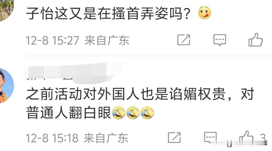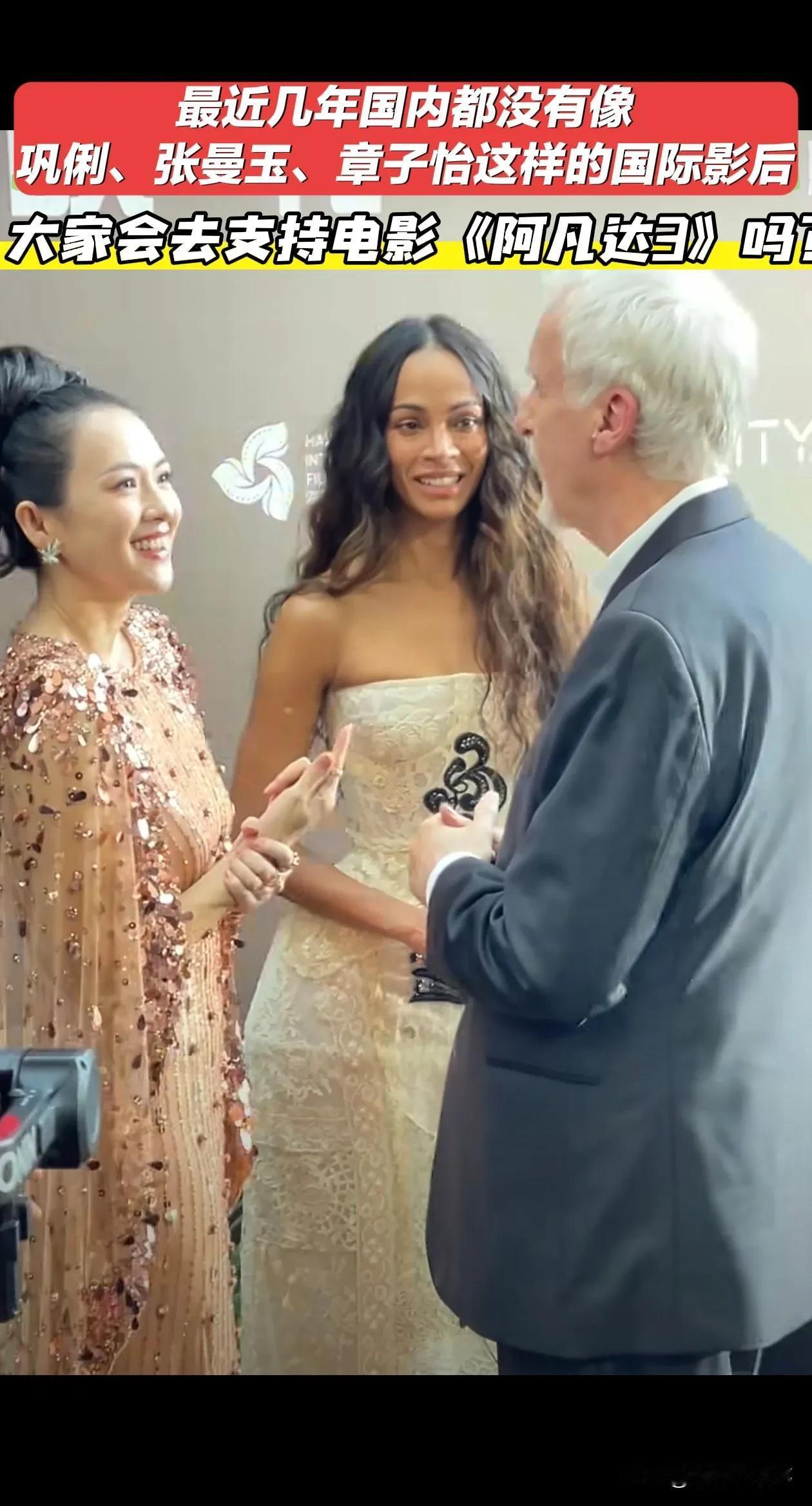 《阿凡达3》中国首映礼现场,导演詹姆斯·卡梅隆与章子怡热聊。 章子怡感谢导演给这几位中国演员 再一次参与阿凡达这个系列的机会。 网友:搔首弄姿,对外国人谄媚权贵,对国人翻白眼。 网友:人家导演来宣传有合作,章子怡也不能冷脸,不欢迎吧!