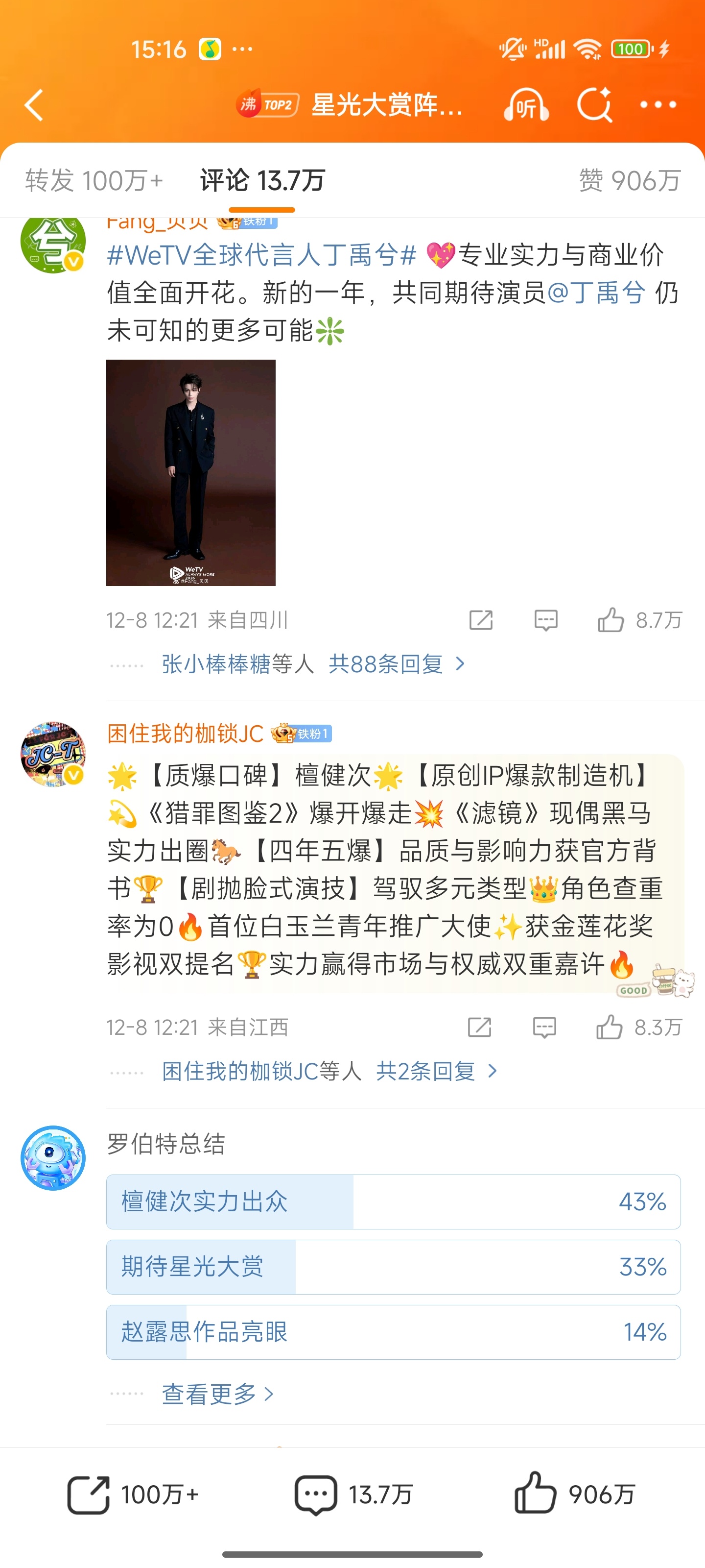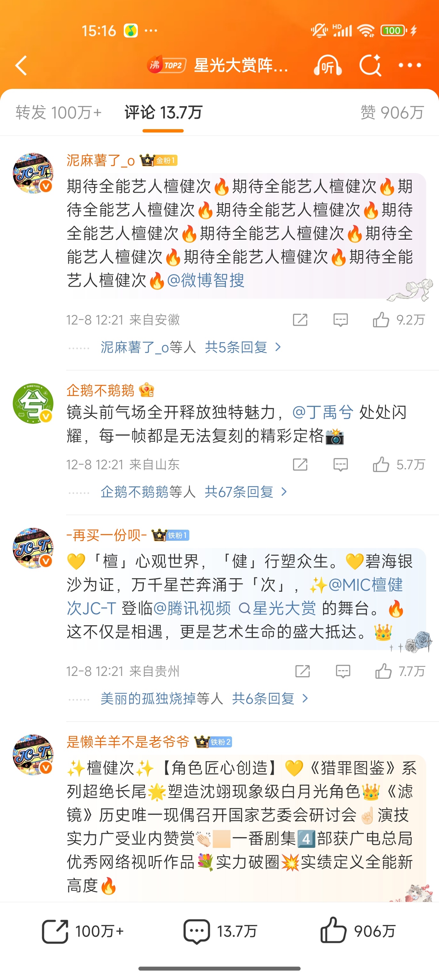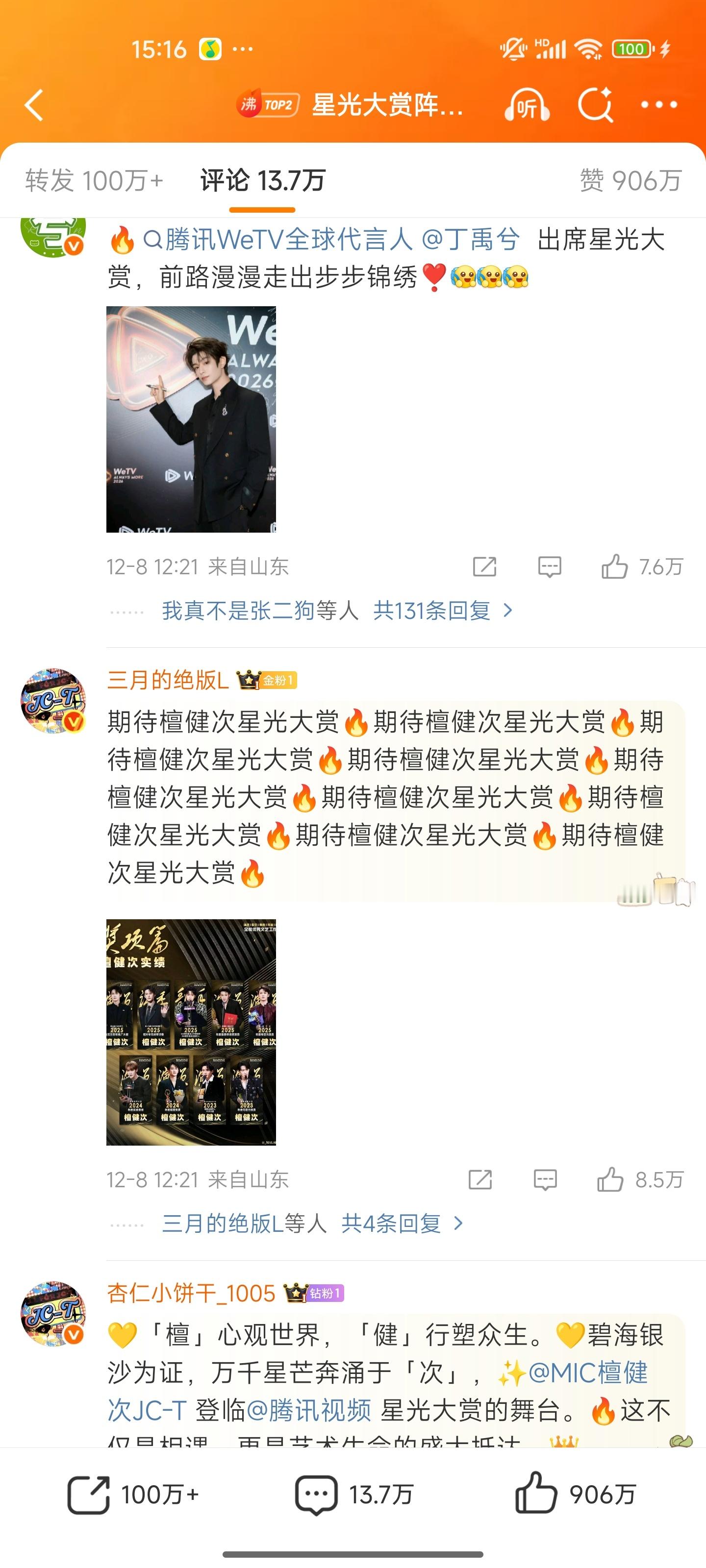 腾讯星光大赏名单公布评论区前排被檀健次粉丝霸占了,丁禹兮家陆陆续续追赶上,但是第一名还是控在檀丝手里,数量上来说也是檀丝多过丁丝。
