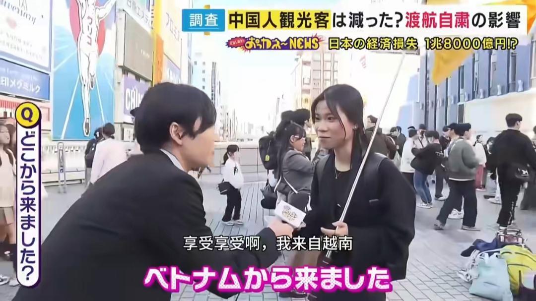 日本媒体为了证明中国游客没有减少,特意去以前都是满大街中国方言的日本心斋桥去采访像东亚裔面孔的游客。只要看到有游客路过,立马弯腰上前问一句:“您来自哪里?” 三拨游客分别回答:新加坡、韩国、越南。 得到的回答让小本子记者大失所望…… 别看他点头哈腰嘴上说谢谢,其实他内心阴湿得很。 去一万来自其他地方的游客,还不如去两千五中国人的消费力。东南亚、印度游客人均消费仅中国游客的1/4。中国人不去,他自称经济损失1.8万亿日元,约818亿元人民币。日本野村研究所测算,中国游客锐减将导致日本GDP下降0.36(约2.2万亿日元/1011亿元人民币),相当于日本全年预期增长率0.6%的60%。 前几天一些在日本务工的越南很多打工人说已经被辞职了。每减少100万中国游客,日本将流失2.3万个岗位。导游转行送外卖,巴士公司停运成普遍现象。 东京银座奢侈品店销售额跌36%,资生堂股价单日暴跌11%。 大阪酒店退订率超70%,爱知县某酒店单笔损失2000万日元订单。 京都和服租赁客流减少30%。奈良鹿拼摊主日收入接近归零。 中文导游进入强制休假状态,北海道滑雪教练面临失业。 这不挺好,大家都满意!