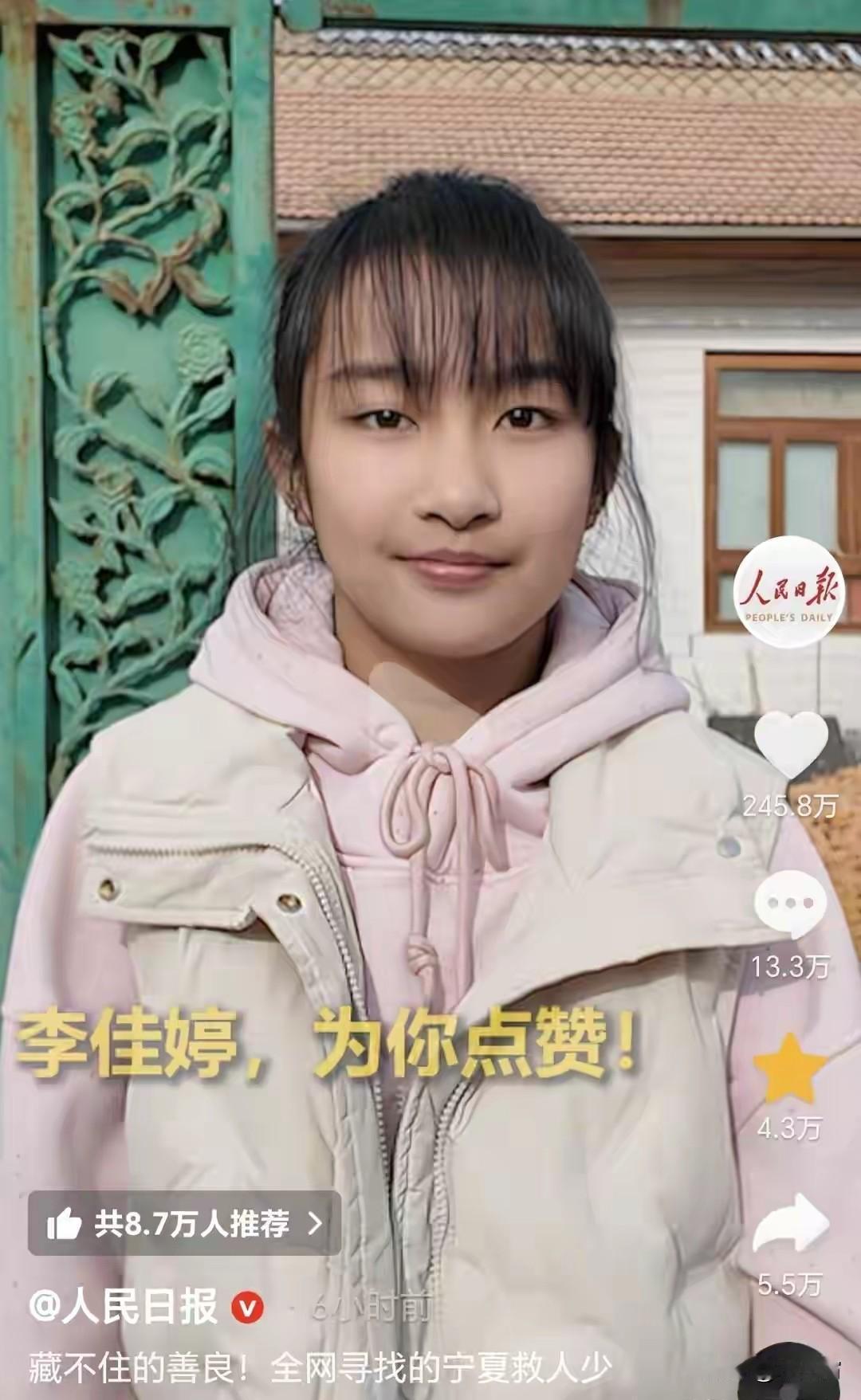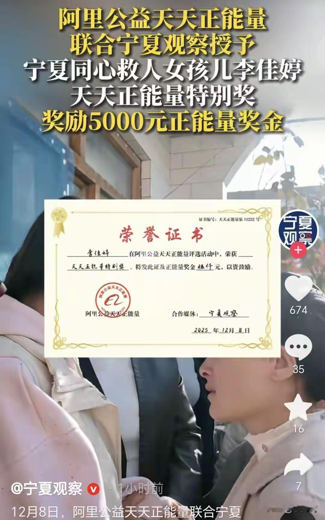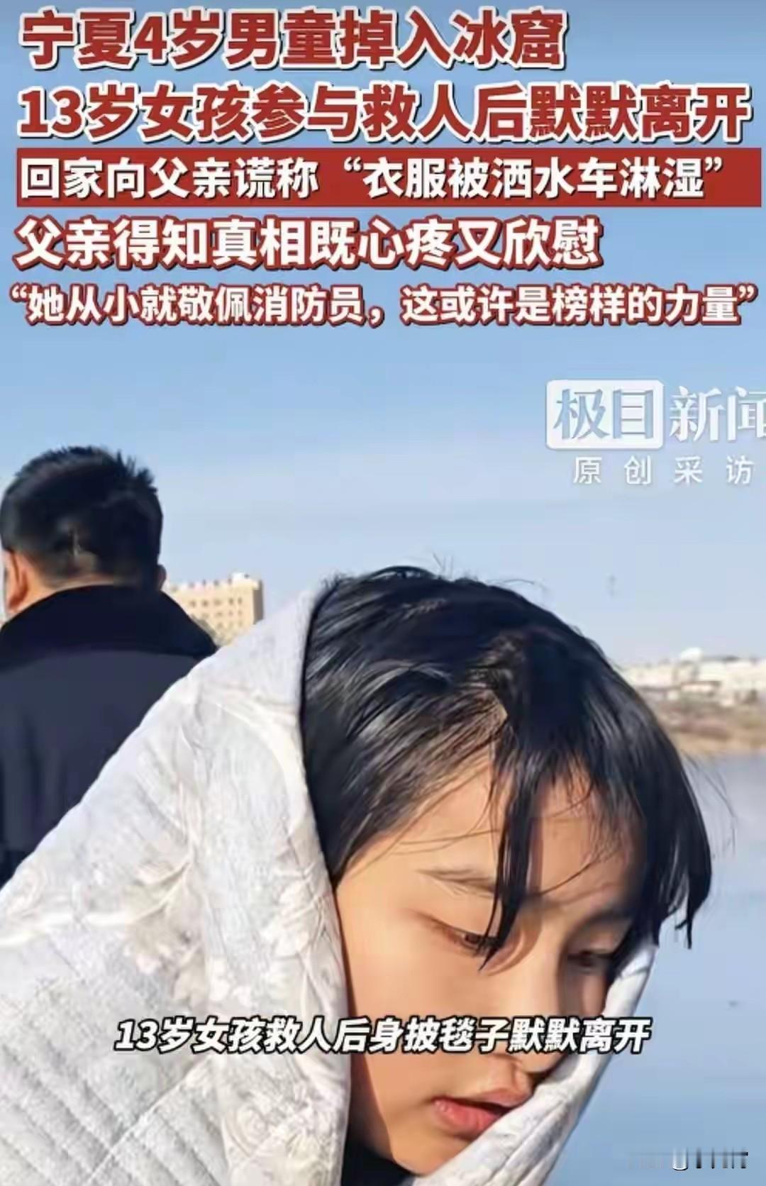 人民日报点赞,阿里奖励5000元,冰窟救人后谎称“被洒水车淋湿”,13岁女孩这波“硬核操作”火了!这件事让网友看得人心里又暖又酸! 这是前两天发生的事,宁夏同心县一个4岁男童掉进冰窟,命悬一线。这时候,路过的13岁女孩李佳婷没含糊,直接来了一句:“阿姨,我身体轻,我来救!” 这孩子真不是瞎冲,她知道大人体重压强大会压塌冰面,所以她趴在地上,借着身体轻的优势,一点点往孩子身边蹭。虽然最后冰面还是塌了,她自己也掉进刺骨冰水里,但她死死攥着救援管,愣是把孩子给拖住了! 最让人没想到的是后续。人救上来后,李佳婷裹着毯子悄悄溜回家了。面对老爸看着湿透衣服的追问,她怕父母担心,居然淡定撒谎说:“爸,没事,路上被洒水车喷到了。” 要不是姑姑刷视频认出侄女,这“惊天秘密”怕是还要瞒一辈子了。这孩子,平时跟着奶奶长大,独立又懂事,救人时那是真勇,回家后那是真“怂”(怕爸妈担心)。 第二天,被救家属带着钱和宰好的羊上门感谢,李爸爸那是坚决拒收现金,硬气得很!最后对方没办法,只好强行留下了水果和羊肉。 12月8日,学校在升旗仪式上专门表彰了这位“最美小英雄”,阿里公益也奖励了5000元正能量奖金。 这事儿最打动我的是,李佳婷事后说:“以后遇到这种事,我还是会帮,但我会换一种更安全的方式。” 这才是咱们中国少年该有的模样:见义勇为,但不盲目冲动;善良懂事,心里还装着父母。 对于这位“又勇又刚又懂事”的宁夏小姑娘,大家觉得值不值得一个大大的赞?欢迎在评论区聊聊!宁夏女孩救人 13岁女孩救人