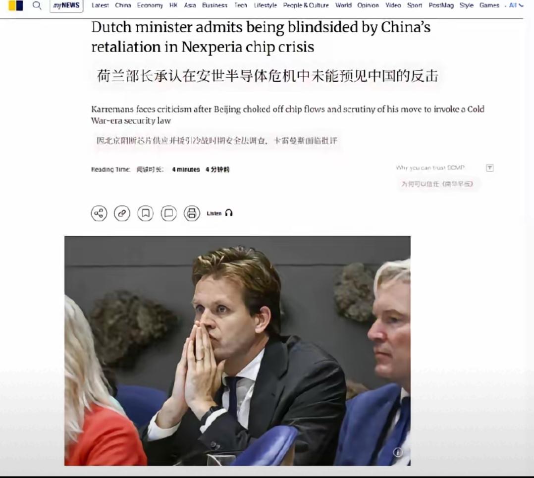 真的越看越觉得西方国家的政客离谱到可笑,荷兰经济部长卡雷曼斯这波操作简直把自大和短视刻在了骨子里。明明是荷兰先不讲规矩,强行干预中国企业控股的安世半导体,结果中方出台成品芯片出口限制后,他居然说自己完全没料到,被打了个措手不及,这不是搞笑吗? 说白了就是骨子里没把中国的反击当回事,要么是蠢到不懂基本的博弈逻辑,觉得中国会忍气吞声;要么是狂到极致,笃定我们不敢维护自身权益。一个国家核心部门的高官,连这么基础的预判都没有,决策鲁莽又草率,连本国议员都骂他外行,足以看出西方不少政坛人物早就脱离了现实,满脑子都是霸权思维。他们总想着用霸权掠夺利益,却忘了现在的中国早已不是任人拿捏的样子,敢出手就别怕我们反击。 说到底,西方政坛的这种腐朽,本质上是霸权思维下的自我麻痹,以为靠强权就能左右一切。大家觉得这种连基本预判都没有的政客,能管好国家发展吗?