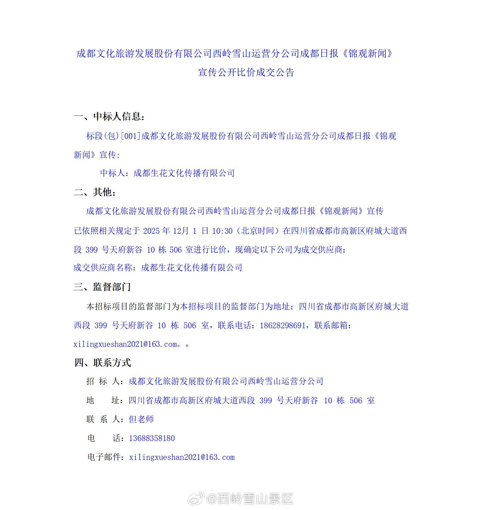 成都文化旅游发展股份有限公司西岭雪山运营分公司成都日报《锦观新闻》宣传公开比价成交公告