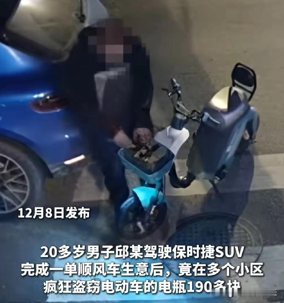 父母的苦心算是白费了。四川,警方抓到一个开保时捷偷电动车电瓶的主。小伙子才20多岁,以前就有偷盗的前科,父母为了让他改邪归正。看他喜欢豪车,就给他花十来万买了一辆二手的保时捷,让他跑网约车。 没想到小伙做完一单生意后,手又痒痒了。他把保时捷停在一个小区门口,扫了辆共享单车,进入小区, 一晚上就偷了30多辆车,190多块电瓶。 小伙把偷来的电瓶放进车筐里带出去,再放回车上。因为多次来回往返,被小区保安盯上了,保安上去查看时两人发生争执,小伙开车逃跑了。 后来小伙还是被警方抓获。我估计小伙父母知道后都寒心了,他们努力把儿子往正路上引,他年纪轻轻的,怎么就不学好呢?只能说,自作孽不可活! 对于这件事,你有什么看法呢?