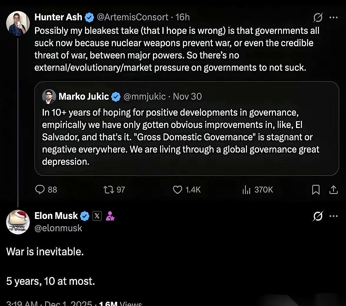 马斯克凌晨三点不睡觉,在网上敲下一行字:战争不可避免,五年,最多十年。 你以为他