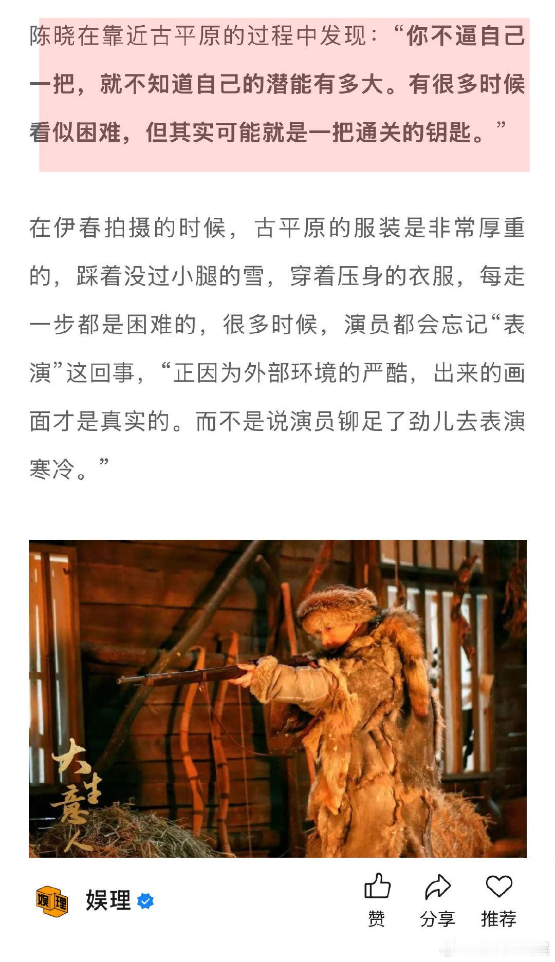 陈晓说身体眼神是服务角色的 陈晓回应被说有书生气 陈晓《大生意人》中的杀青戏在内蒙古。提前一周,他就让自己进入“离别”的状态,真到杀青时反而没有太多不舍。离开古平原,陈晓没有着急进入新项目,“当时是暂时没有遇到合适的、想要去演的角色。如果没有遇到特别合适的角色,我不需要强行让自己马上进入工作状态。还是要以自己发自内心想要去创作为第一位。” 陈晓回应瘦好多↓
