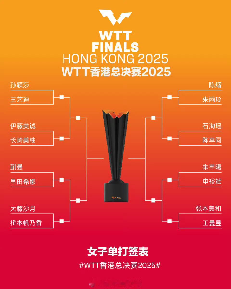 WTT香港总决赛女单签表 WTT香港总决赛将于12月10日至14日在中国香港红磡体育馆进行,女单签表如下:【1/4区】孙颖莎vs王艺迪、伊藤美诚vs长崎美柚【2/4区】蒯曼vs早田希娜、大藤沙月vs桥本帆乃香【3/4区】陈熠vs朱雨玲、石洵瑶vs陈幸同【4/4区】朱芊曦vs申裕斌、王曼昱vs张本美和孙颖莎首轮对阵王艺迪王曼昱首轮对阵张本美和体坛风云