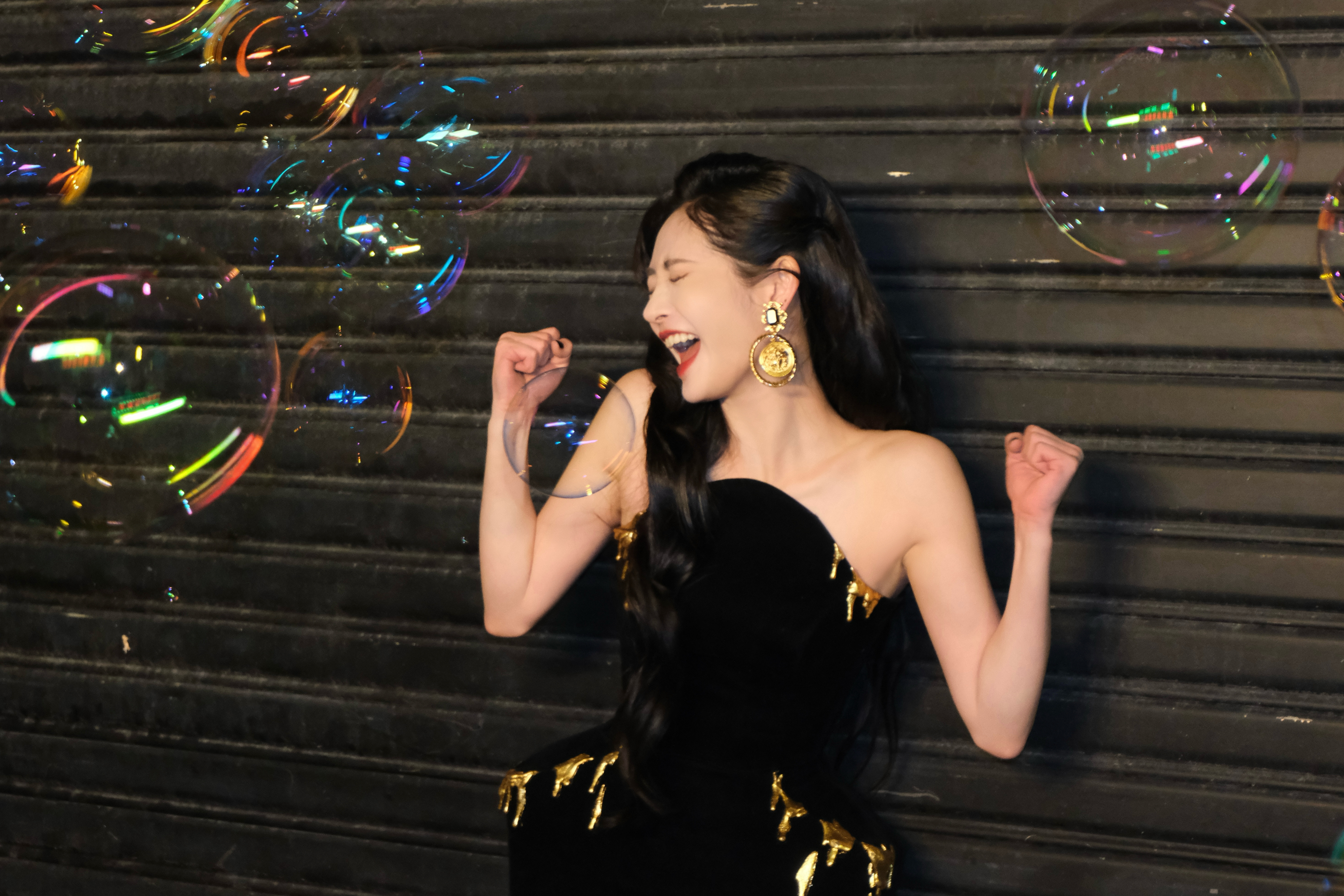 吴艳妮在成都穿着短裤大腿看起来很粗壮,表情自信又张扬