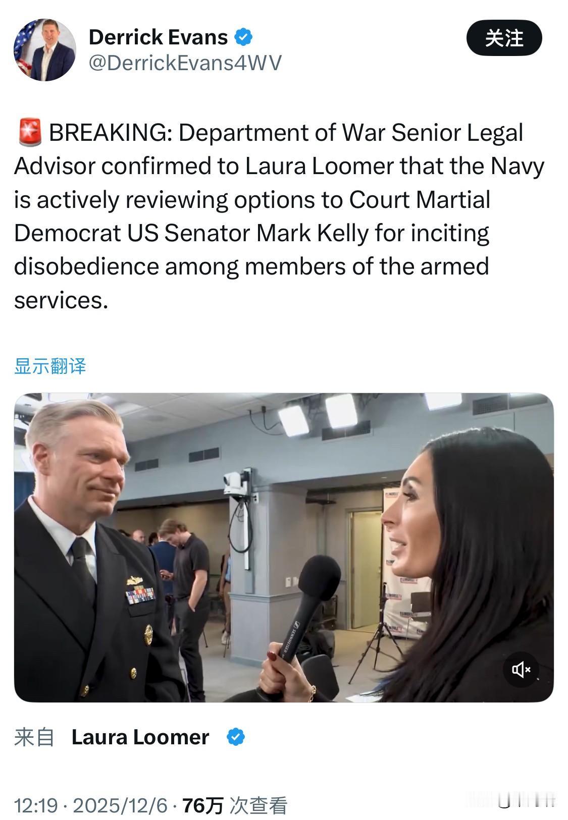 突发新闻:美国战争部高级法律顾问向劳拉·卢默证实,海军正在积极审查各种方案,以煽动军人不服从命令为由,对民主党美国参议员马克·凯利进行军事审判。 劳拉·卢默(Laura Loomer,1993年5月21日出生)是一位美国极右翼政治活动家、媒体人和阴谋论者。她以对美国总统唐纳德·特朗普的坚定支持以及其有争议的言论和行动而闻名。 她目前在五角大楼拥有记者证,声称自己已经取代了《华盛顿邮报》前记者在此的办公桌。