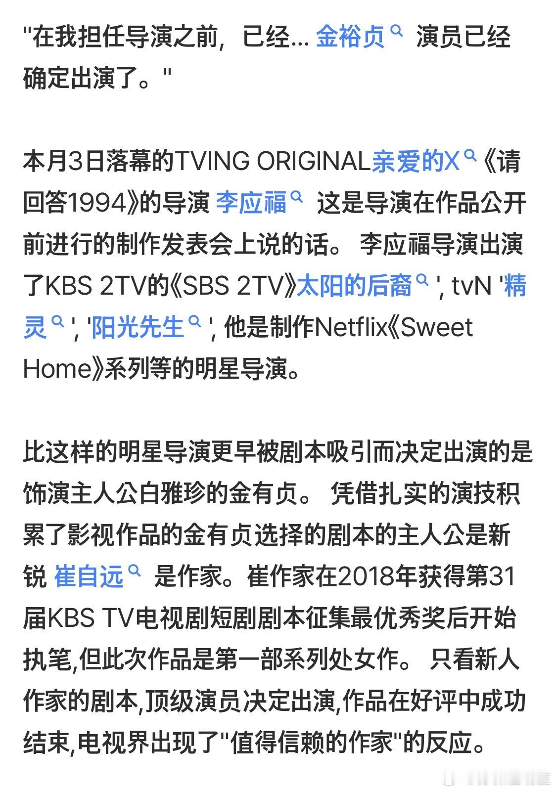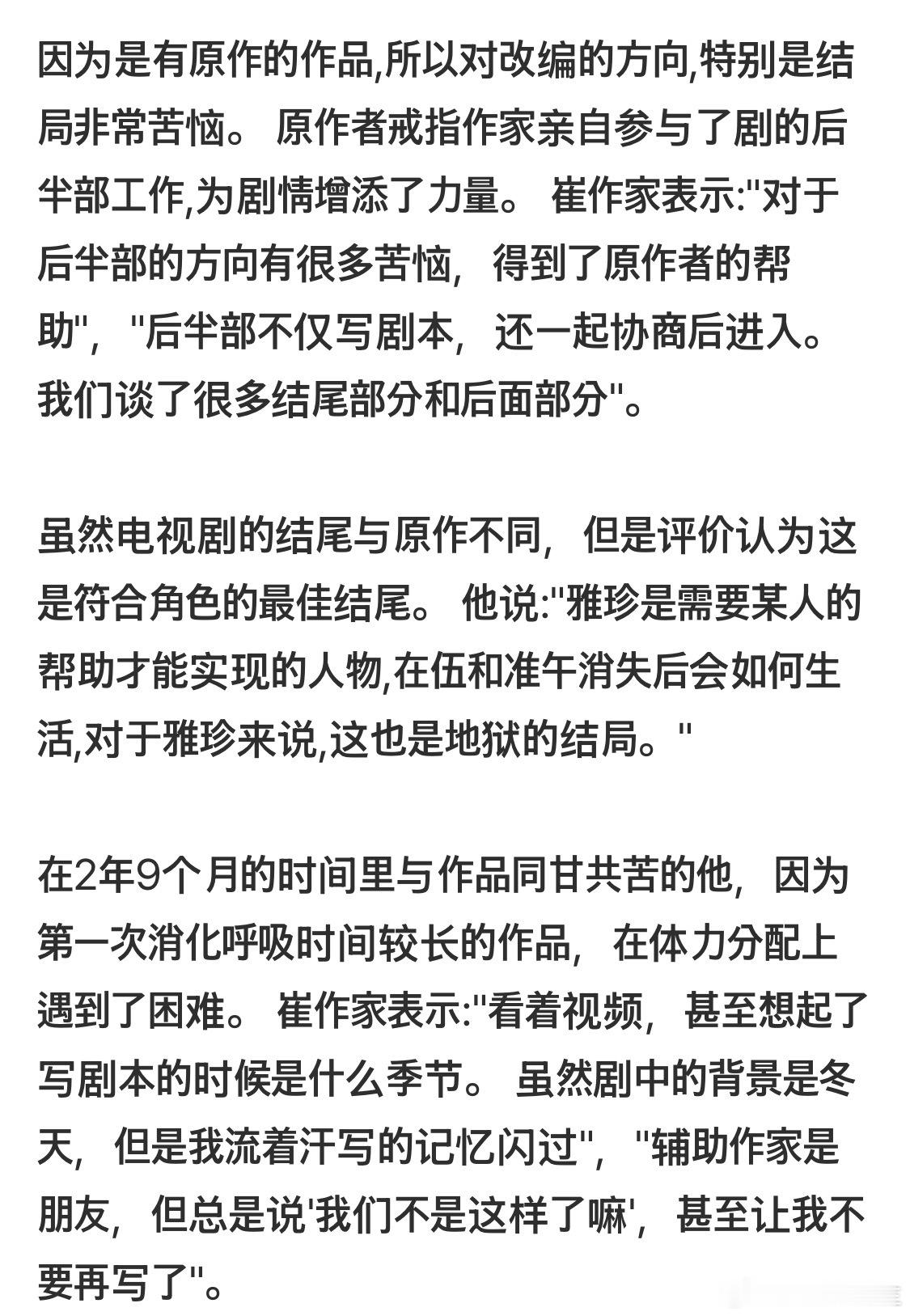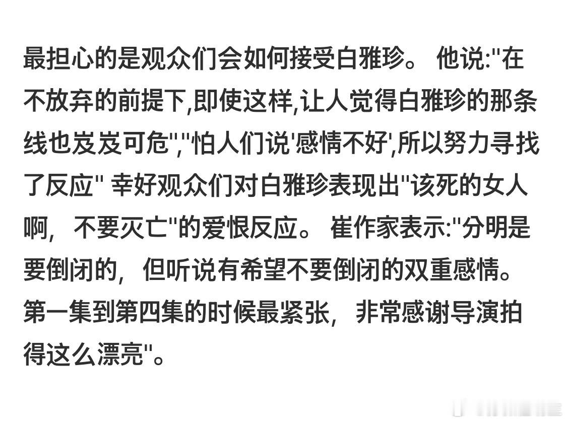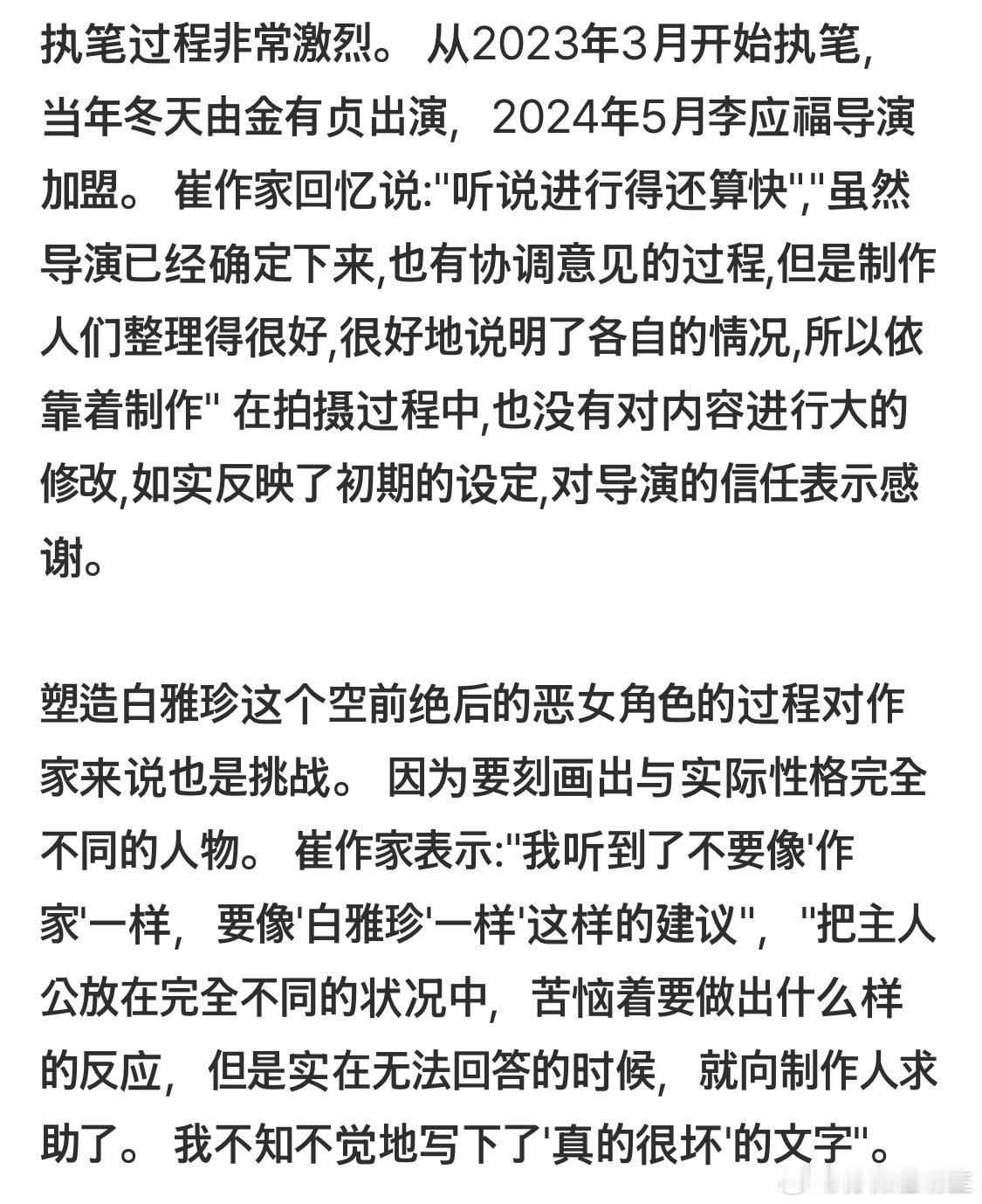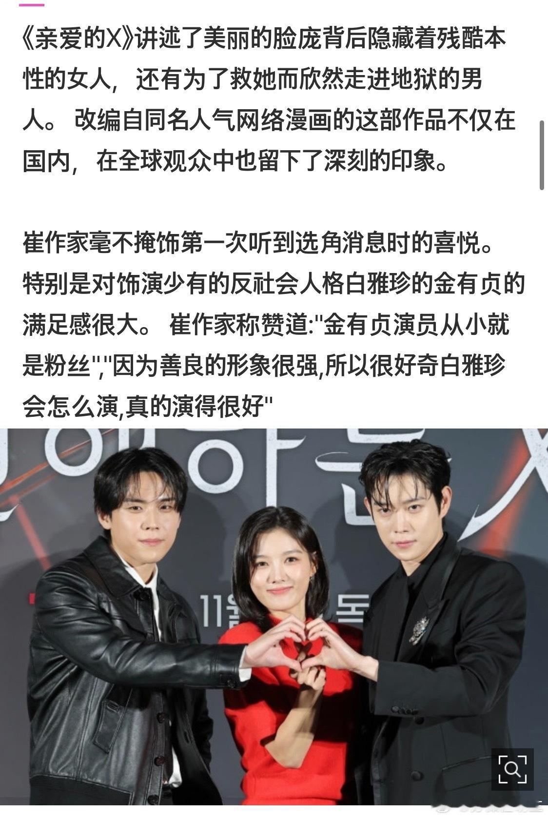韩剧亲爱的x 亲爱的X编剧专访 透露的信息还蛮多的先确定的女主金裕贞,然后确定的导演李应福。拍摄过程中导演对剧情内容几乎没有任何修改。最令人担心的是观众会如何看待白雅珍。在不放弃的界限内,同时还要保持白雅珍的风格那条线非常微妙,很担心人们会说看了就讨厌,所以一直很努力地查看大家的反应。幸运的是观众对白雅珍表现出了"该死的女人别完蛋"这种爱恨交织的反应。崔作家说:(观众们)虽然有明确的她应该完蛋的想法,但又抱有不希望她完蛋的双重感情。第1-4部播出时心情最激动,多亏导演拍得很美,很感谢导演。
