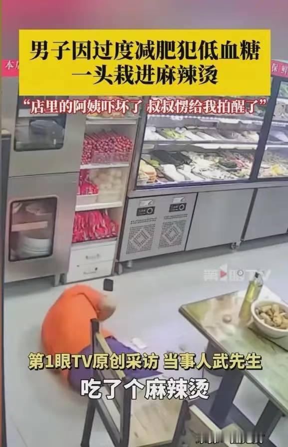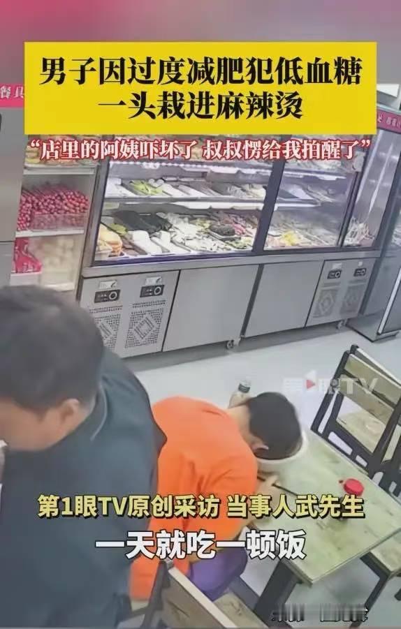 “还敢减肥吗?”内蒙古包头,一男子正低头吃饭,脑袋突然栽进了滚烫的麻辣烫里面,随后倒了下去,老板见状立马掐他人中,男子醒后发现脸被烫伤,还有辣椒进了眼睛,疼得他哇哇直叫,据悉,他是因为过度减肥而导致的低血糖晕倒。 包头开理发店的武先生通过极端节食的方式,在9个月里硬生生从200斤减到了150斤。他一天只吃一顿饭,摄入量仅仅是“两个拳头的菜和半个拳头的馒头”。这种近乎“硬饿”的方式,虽然体重数字下降明显,却让他的身体长期处于能量严重透支的状态。 事发当时,武先生正坐在麻辣烫店里,刚刚举起筷子,人突然就像断电一样,意识瞬间消失,整张脸直接埋进了滚烫的碗中,随后从座位上摔到地上。他后来回忆,那一刻只感到身上一阵发冷,接着就失去了知觉。 醒来后,他感到面部火辣辣地疼,滚烫的辣汤不仅灼伤了皮肤,还溅到了眼镜上。经医生诊断,他的面部为浅二度烫伤,万幸的是眼镜起到了一定的阻挡作用,眼睛没有受到严重伤害。 这些极端方法虽然能在短期内减轻体重,但减掉的其实更多的是水分,还非常容易反弹,会对身体造成严重伤害,如低血糖、电解质紊乱、营养不良甚至心源性晕厥。 当你意识到肥胖时,合理控制饮食摄入、循序渐进地增加运动、保证充足睡眠,才是可持续且真正有益于健康的途径。 减肥的目的是为了追求健康的生活,而不是单纯追求数字的下降,通过过度节食这种不健康的方式瘦下来,导致身体虚弱、无法正常生活,这是本末倒置的。 各位读者你们怎么看?欢迎在评论区讨论。
