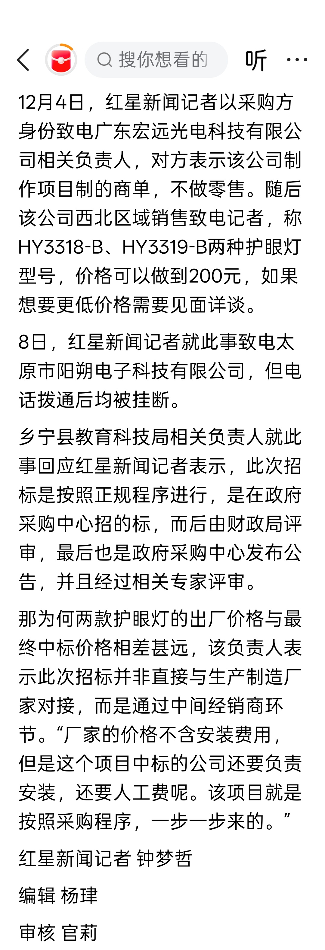 网友反映“护眼灯出厂价一两百、中标价七八百” 当地回应:含人工费等