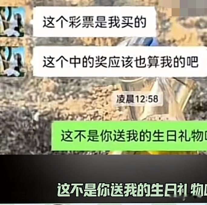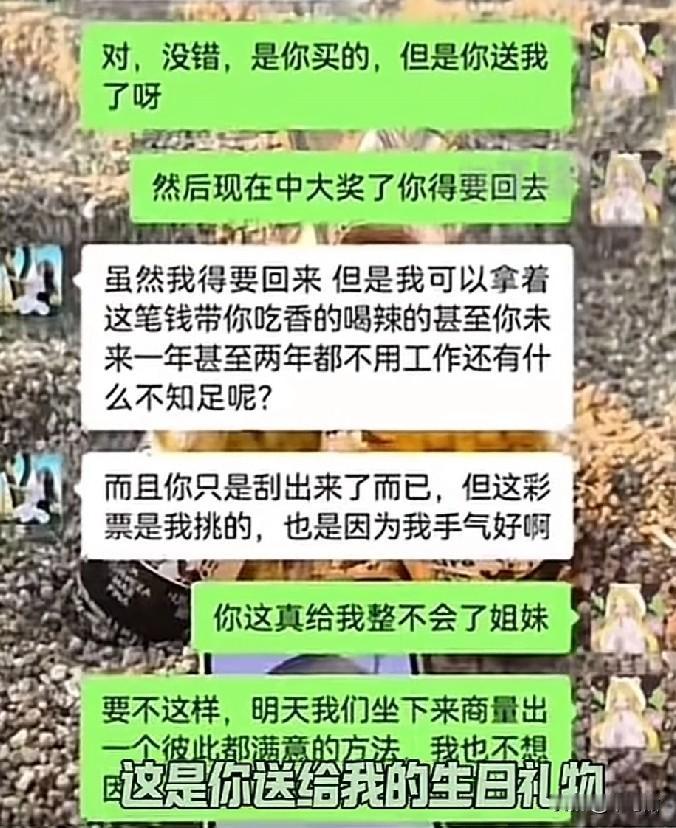 一年轻女孩过生日,闺蜜送了几张刮刮乐给她,还祝福预中一百万哦。没成想,闺蜜这张嘴就跟开了光一样,过生日的女孩还真的中了一百万。 于是女孩为了分享这份快乐,在她们之间的小群里发布了这件事,没想到这样的好事真的发生在了她身上。 就在这时,送彩票的闺蜜就发来是私信,问她是真的还是假的,得到肯定以后,就开始问她这个钱要怎么处理? 过生日的女孩很是不可思议,说这是你送我的生日礼物,已经是我的东西了,她可以带这群闺蜜们出去旅游,随便怎么玩都行。 可是闺蜜不乐意了,说有购买彩票的转账记录,可以证明这张中奖的彩票是她买的,这个钱肯定和她有关系,毕竟是她选的。 这一下反而把女孩整不会了,虽然是闺蜜送的彩票,但是已经送出去了,现在看着中奖了反而不开心,想索要回去,换谁也不乐意,大家觉得这彩票应该还回去吗? (图片来自网络视频)