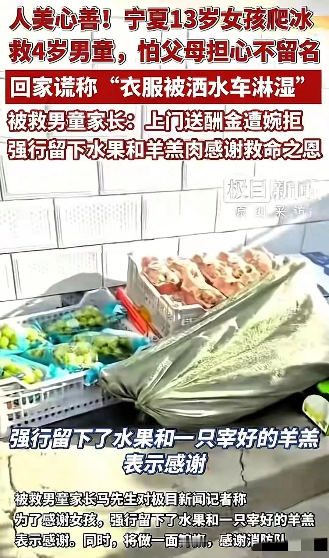 宁夏13岁女孩李佳婷救起的4岁男童的家长,上门给救命恩人送来了酬金、水果以及一只宰好的羊羔肉,但是酬金被女孩家长婉拒,只能强行留下了其他! 13岁的孩子,人美心善。危机时刻,挺身而出,做好事不留名。[赞] 部队应该提前培养这孩子,有责任有担当,危急时刻敢于挺身而出,从军绝对是个好苗子。[赞] 小姑娘人美心善,真的是一副菩萨像。小小年纪都奋不顾身救人于水火,将来一定能成为对社会有大贡献的人!政府应该奖励100万弘扬社会正能量。[祈祷] 你把钱财放在功德箱,你就是信众,你把大爱给了需要的人,你就是菩萨!点赞少年英雄李佳婷! 网友说:13岁女孩李佳婷勇救4岁男童超赞!家长登门致谢很暖心,双向善意让正能量传递,值得大家点赞~[赞]
