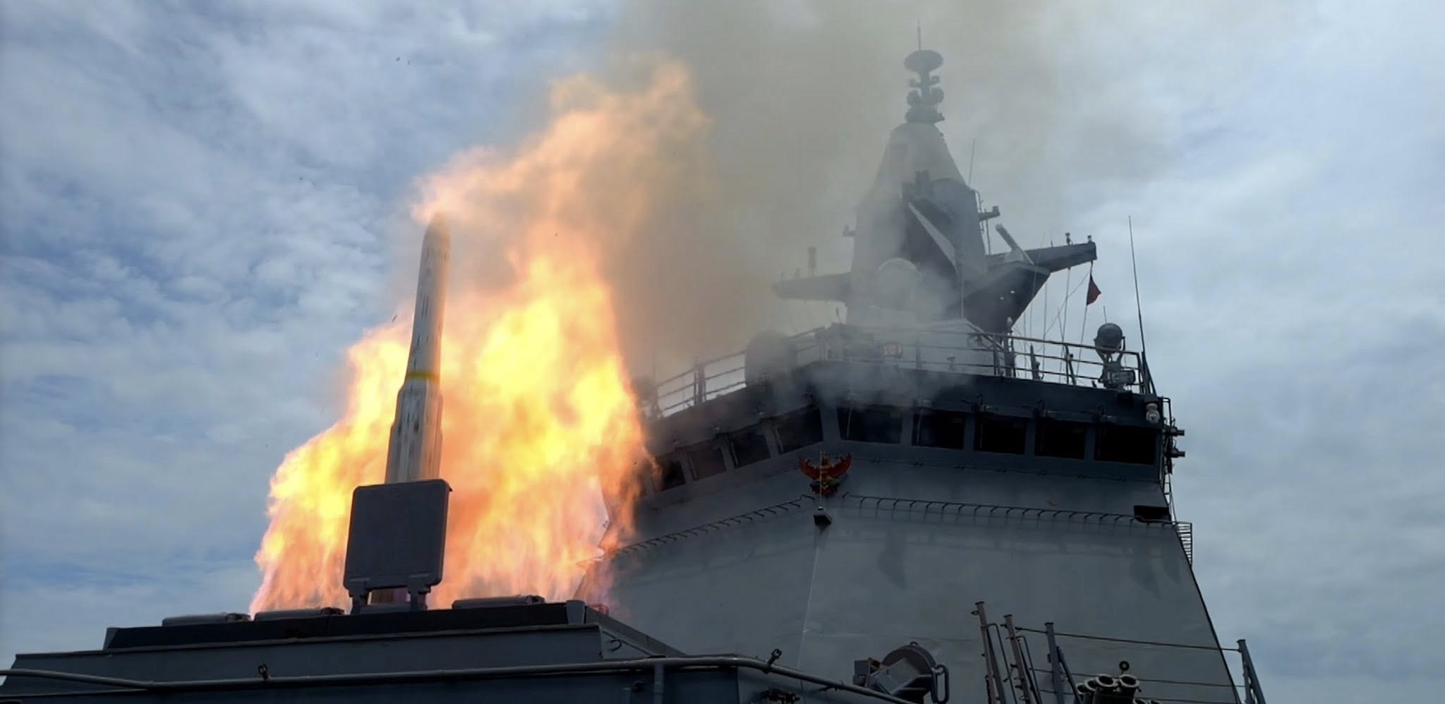 泰国“普密蓬·阿杜德”级护卫舰首舰“普密蓬·阿杜德”号(FFG-471)发射RIM-162 ESSM舰对空导弹,首舰于2019年1月7日服役,是泰国皇家海军向韩国订购的新型护卫舰,首舰原名“他钦”号(FFG-471),服役前夕为纪念2016年去世的泰王普密蓬而改名为“普密蓬.阿杜德号”,首舰在韩国建造,后续舰技转由泰国建造。泰国采购这两艘护卫舰是为了替代2015年退役的两艘原美国海军诺克斯级护卫舰。该舰的采购计划早在2013年就已经确定,当时还进行了颇为激烈的竞标过程,韩国大宇造船与海事工程公司(DSME)的DW3000方案最终击败了包括中国的F-40T方案(基于054A)在内的众多对手获胜。每天认识一件兵器烽火问鼎计划 “普密蓬·阿杜德”号舰首装备一门奥托·梅莱拉76毫米62倍径舰炮超快速型;主炮后方抬高甲板上安装了八联装美制MK-41垂直发射装置,泰国目前仅计划为其配备ESSM“改进型海麻雀”,共装填32枚;舰舯舷墙遮蔽的区域可设置2组四联装“鱼叉”反舰导弹和两艘RHIB突击艇;机库上方和垂发后方各有一座“密集阵”;机库为偏置机库,可容纳一架S-70B直升机。