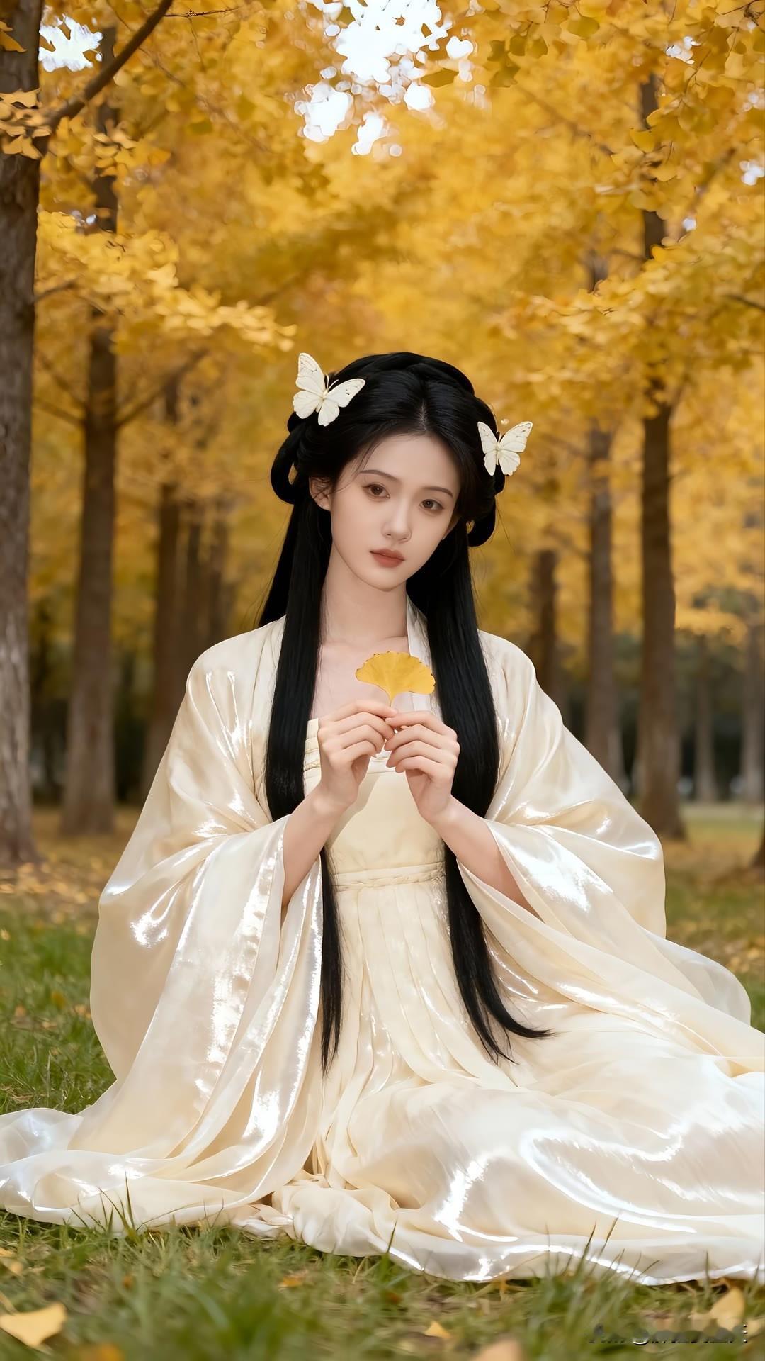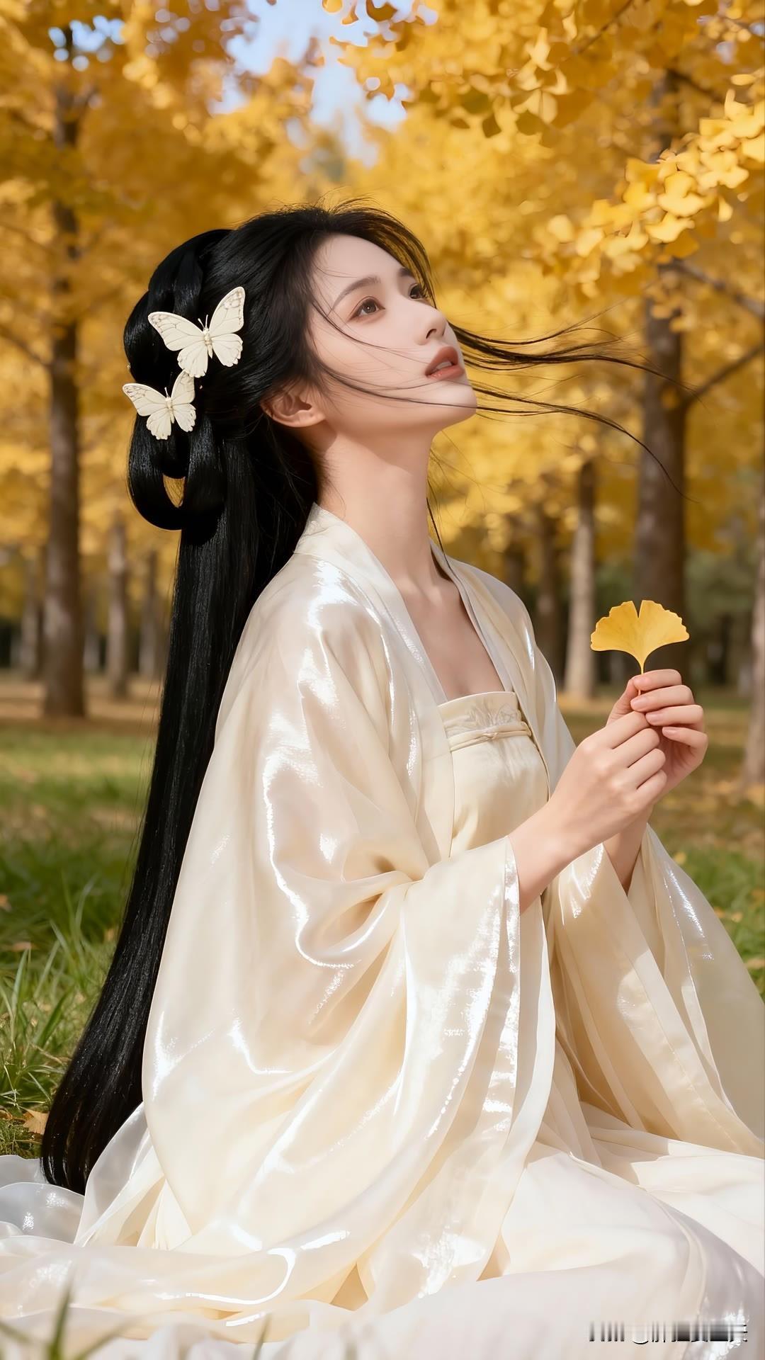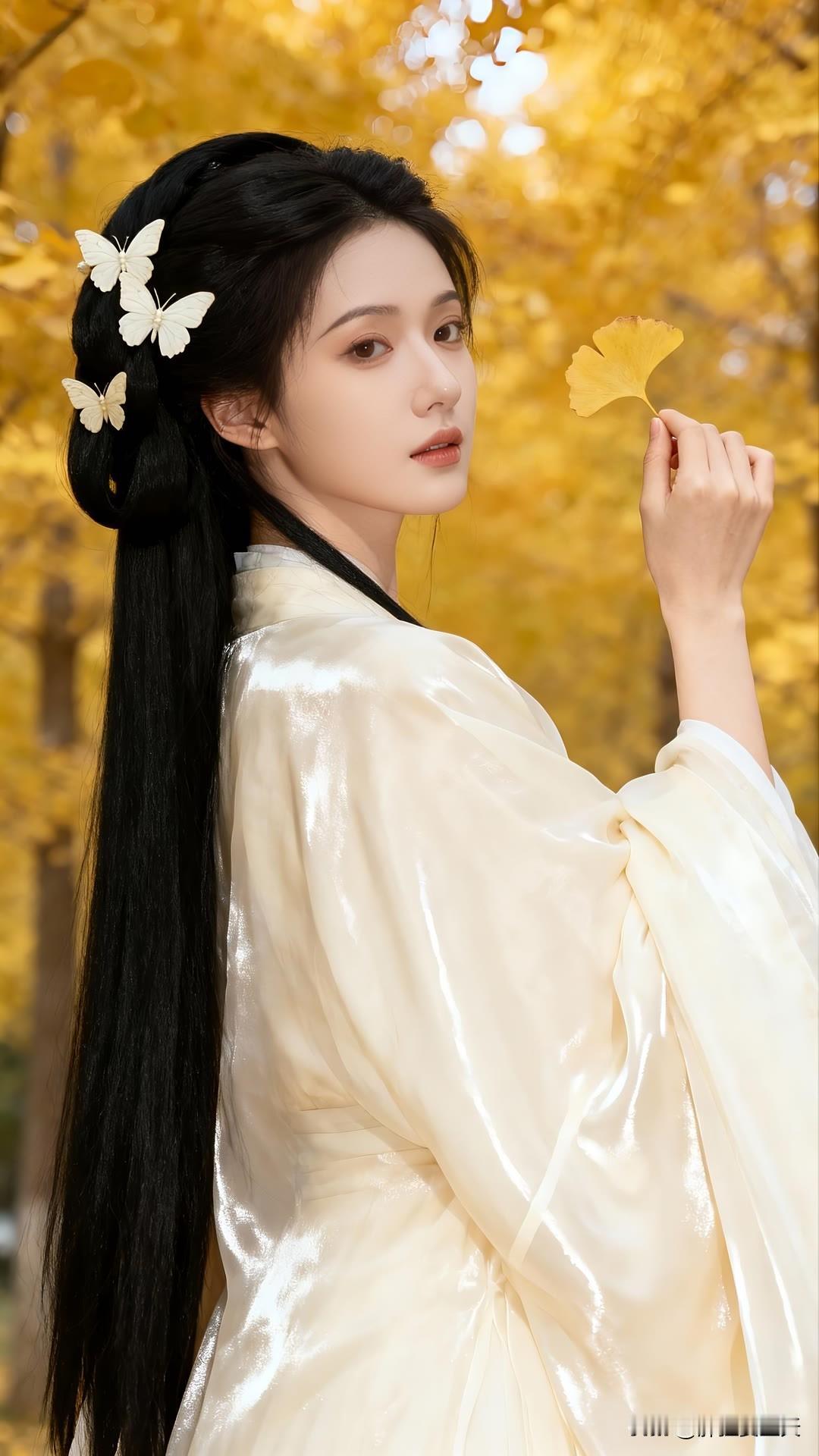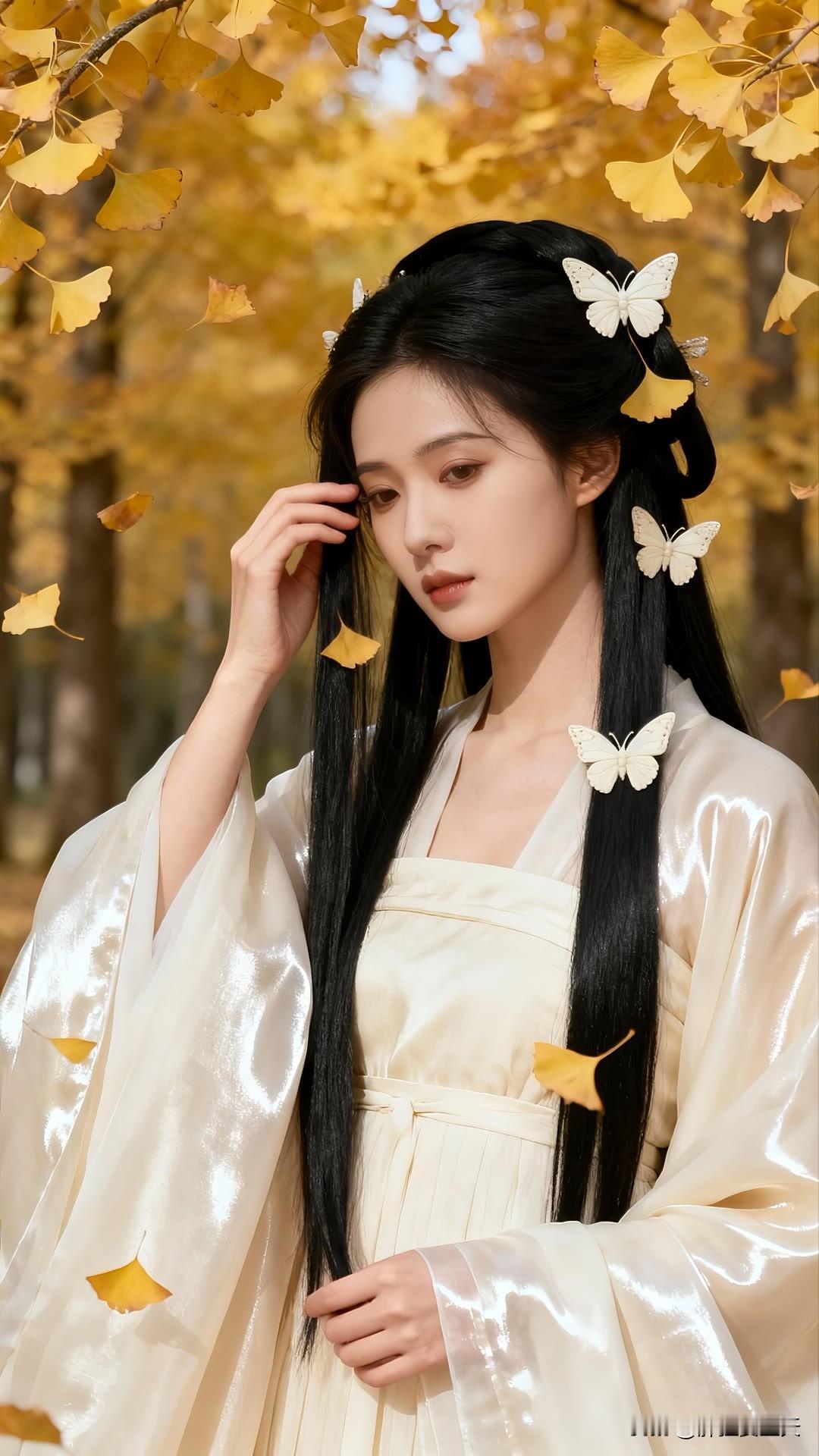 素手轻绾鬓边霜,蝶落云鬟叶满裳。金风拂动千重袖,一低眉间尽秋光。莫道清辉无人识,林深自有白月光。轻纱美人图 温婉古风美女