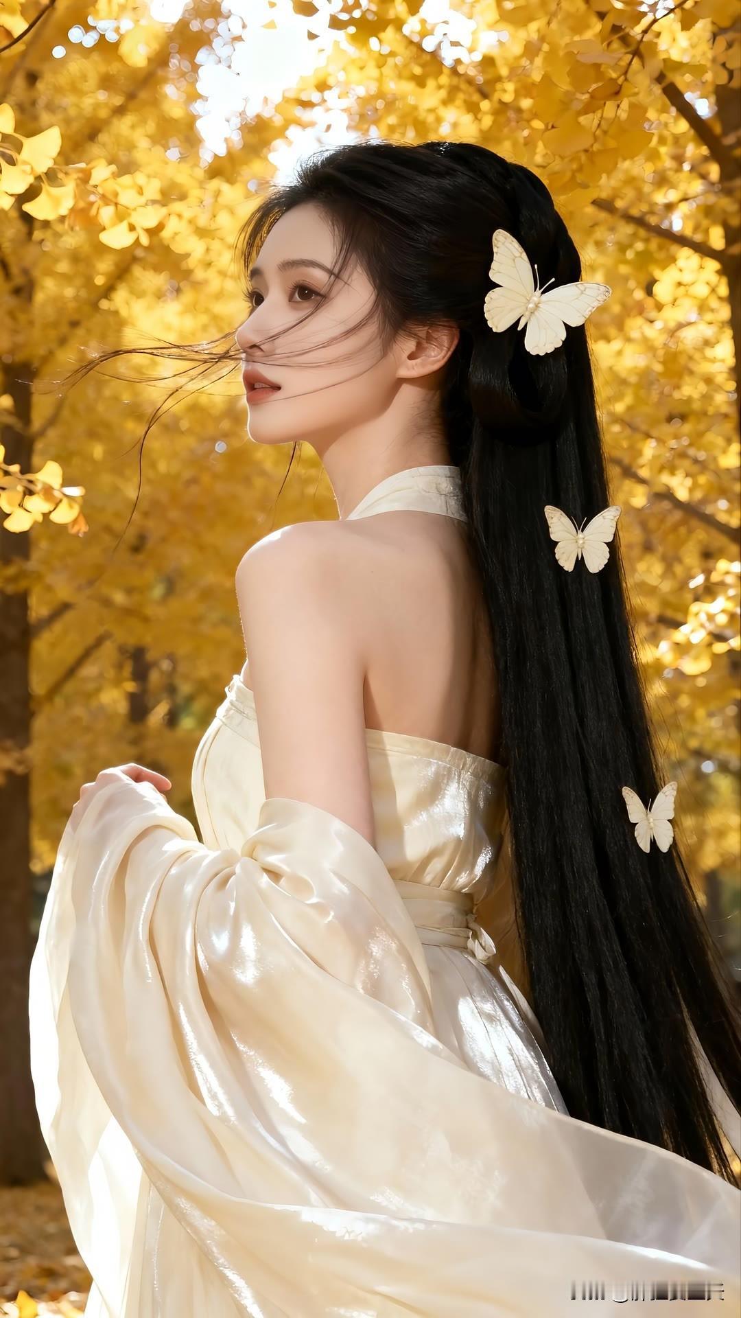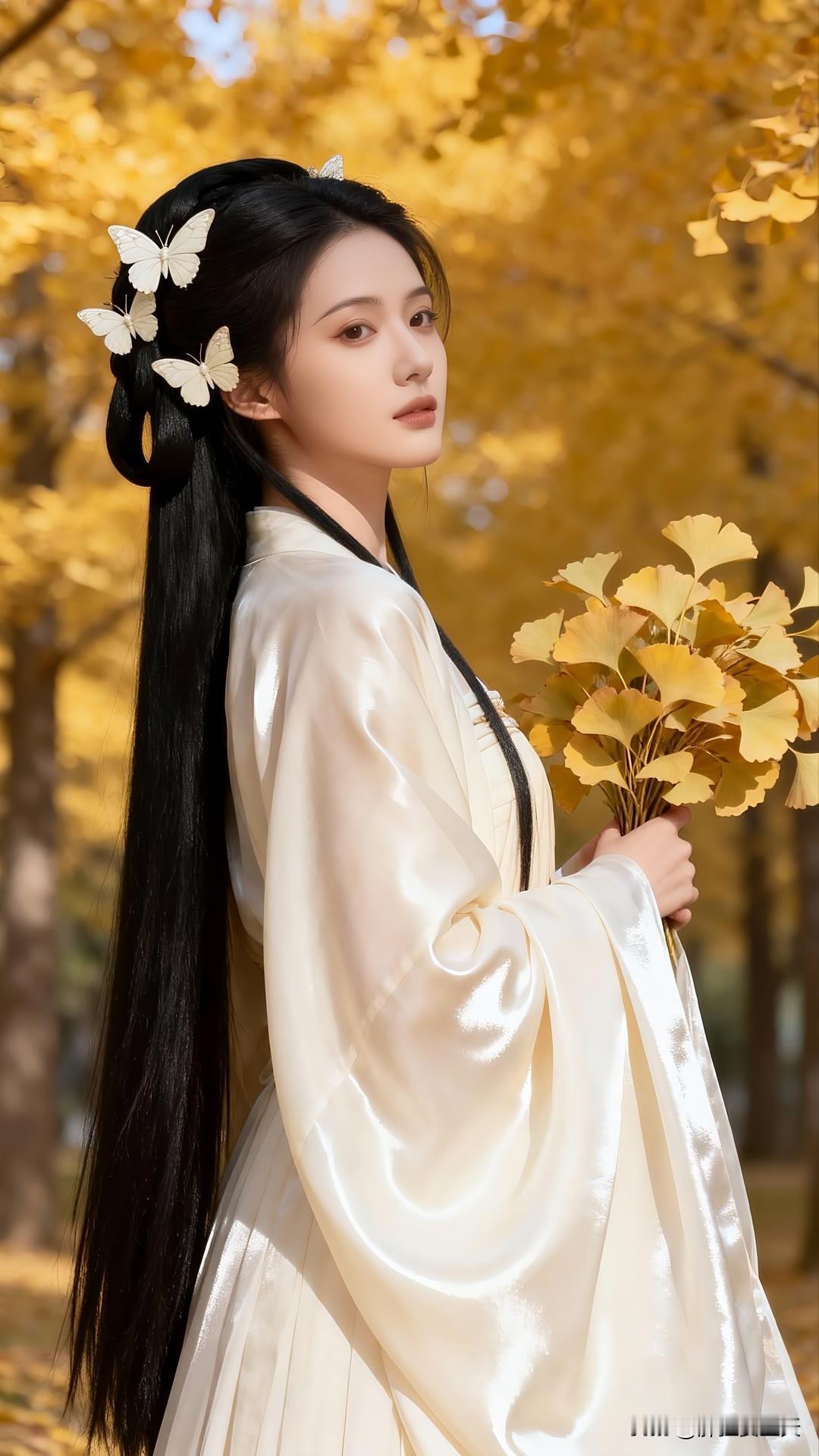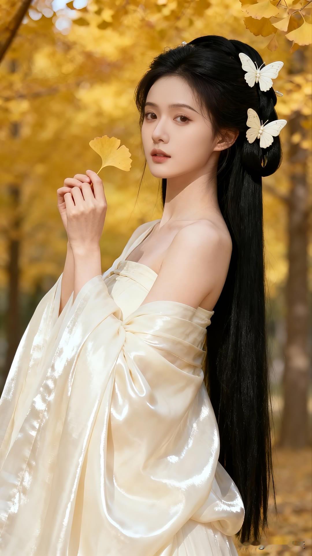 素手轻绾鬓边霜,蝶落云鬟叶满裳。金风拂动千重袖,一低眉间尽秋光。莫道清辉无人识,林深自有白月光。轻纱美人图 温婉古风美女