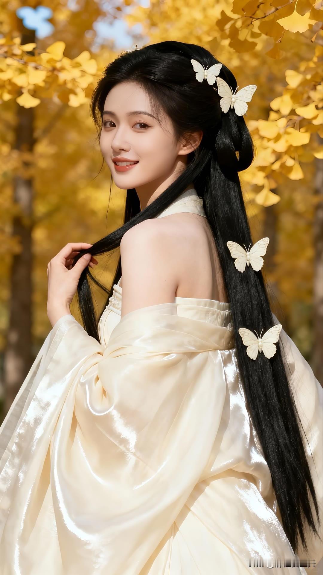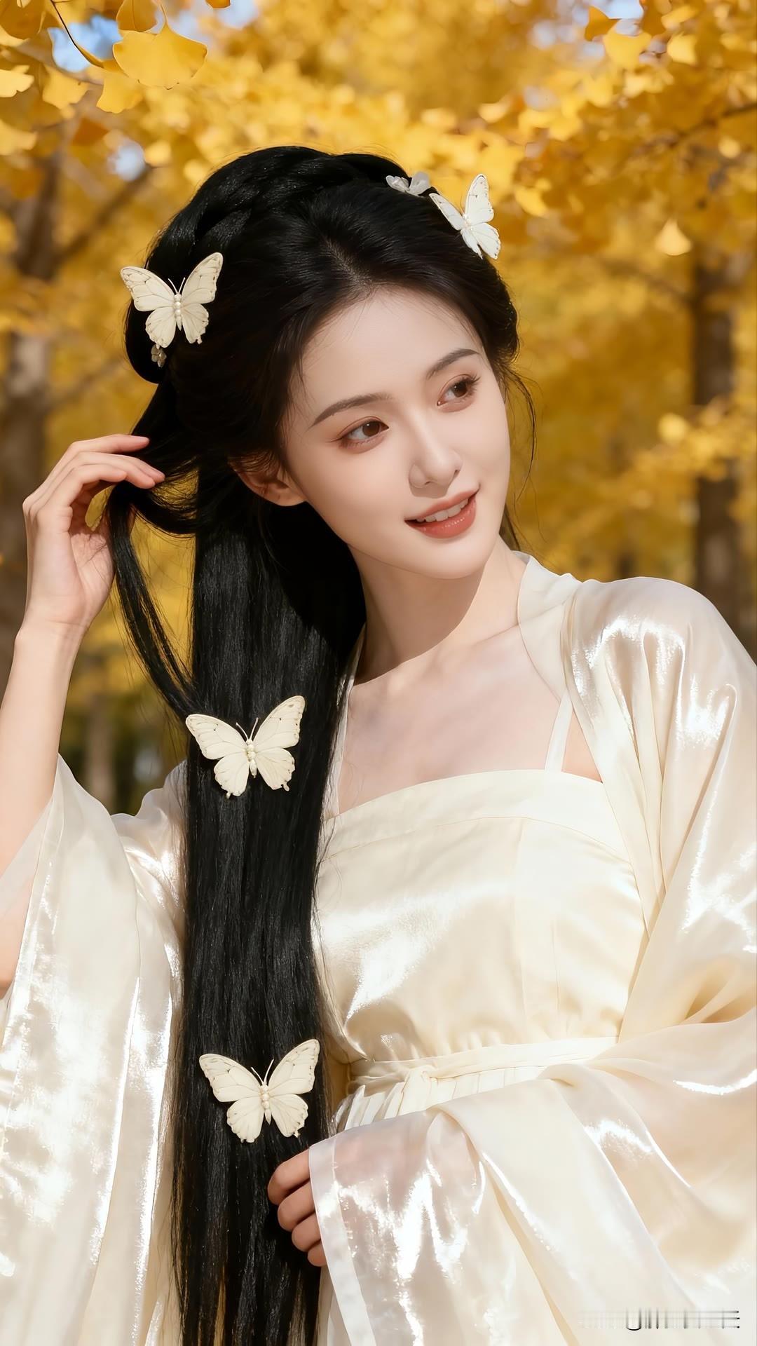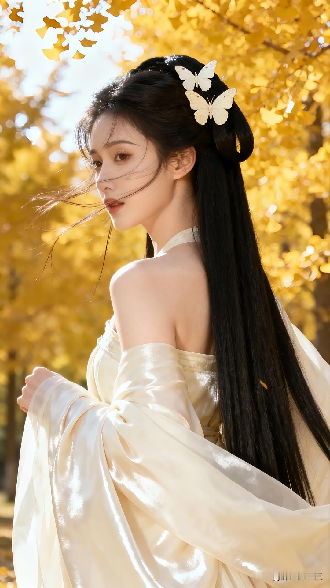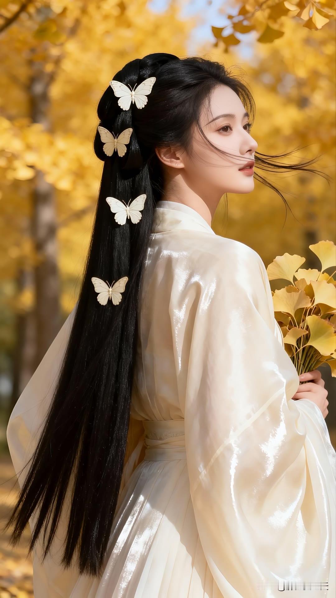素手轻绾鬓边霜,蝶落云鬟叶满裳。金风拂动千重袖,一低眉间尽秋光。莫道清辉无人识,林深自有白月光。轻纱美人图 温婉古风美女